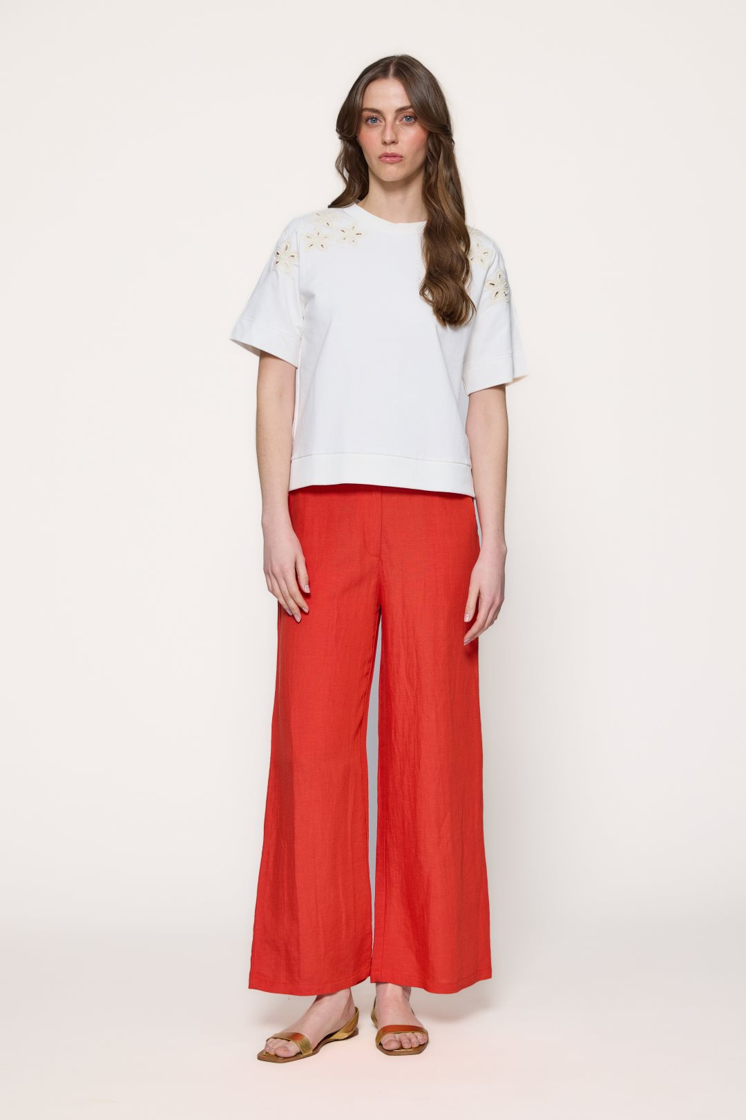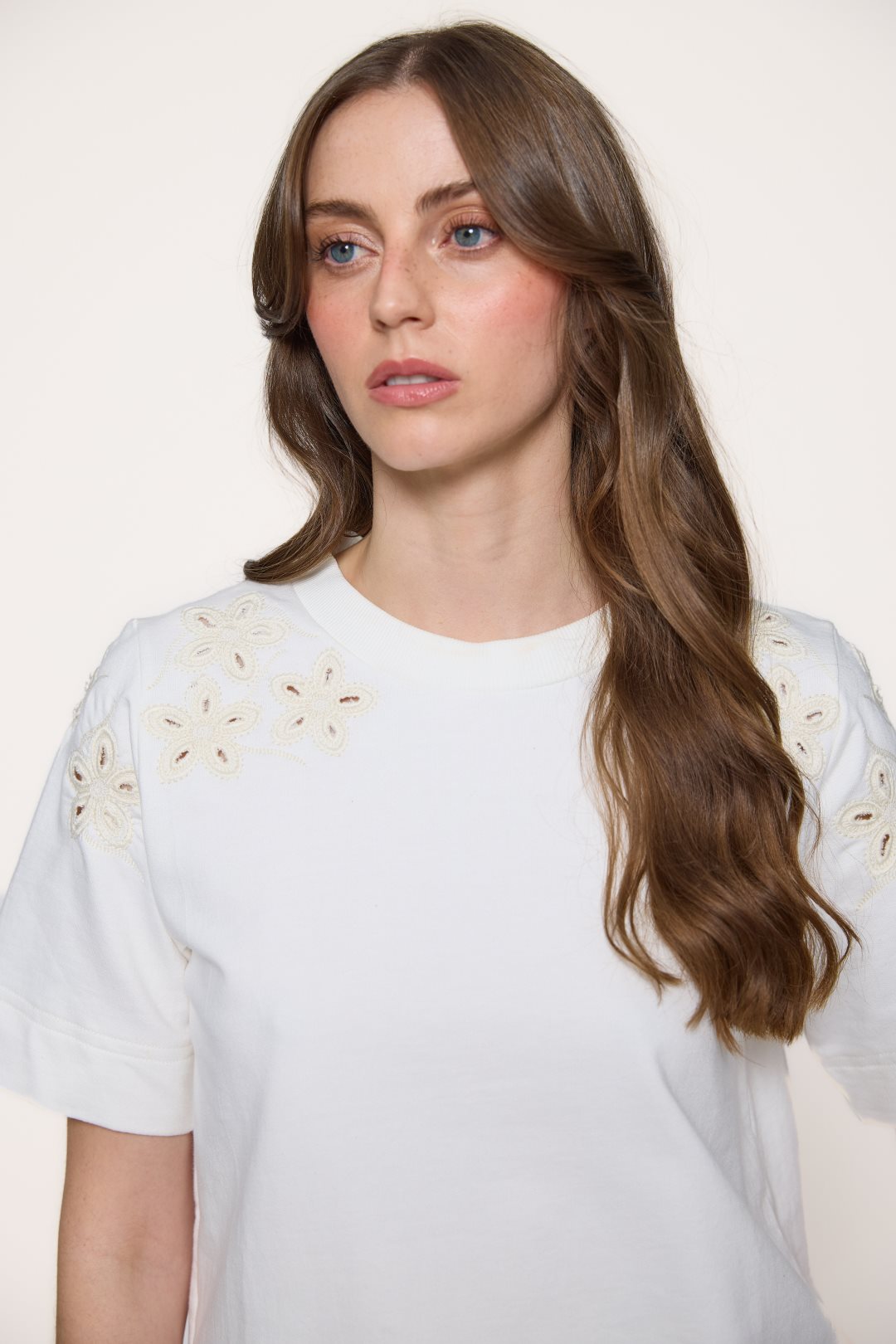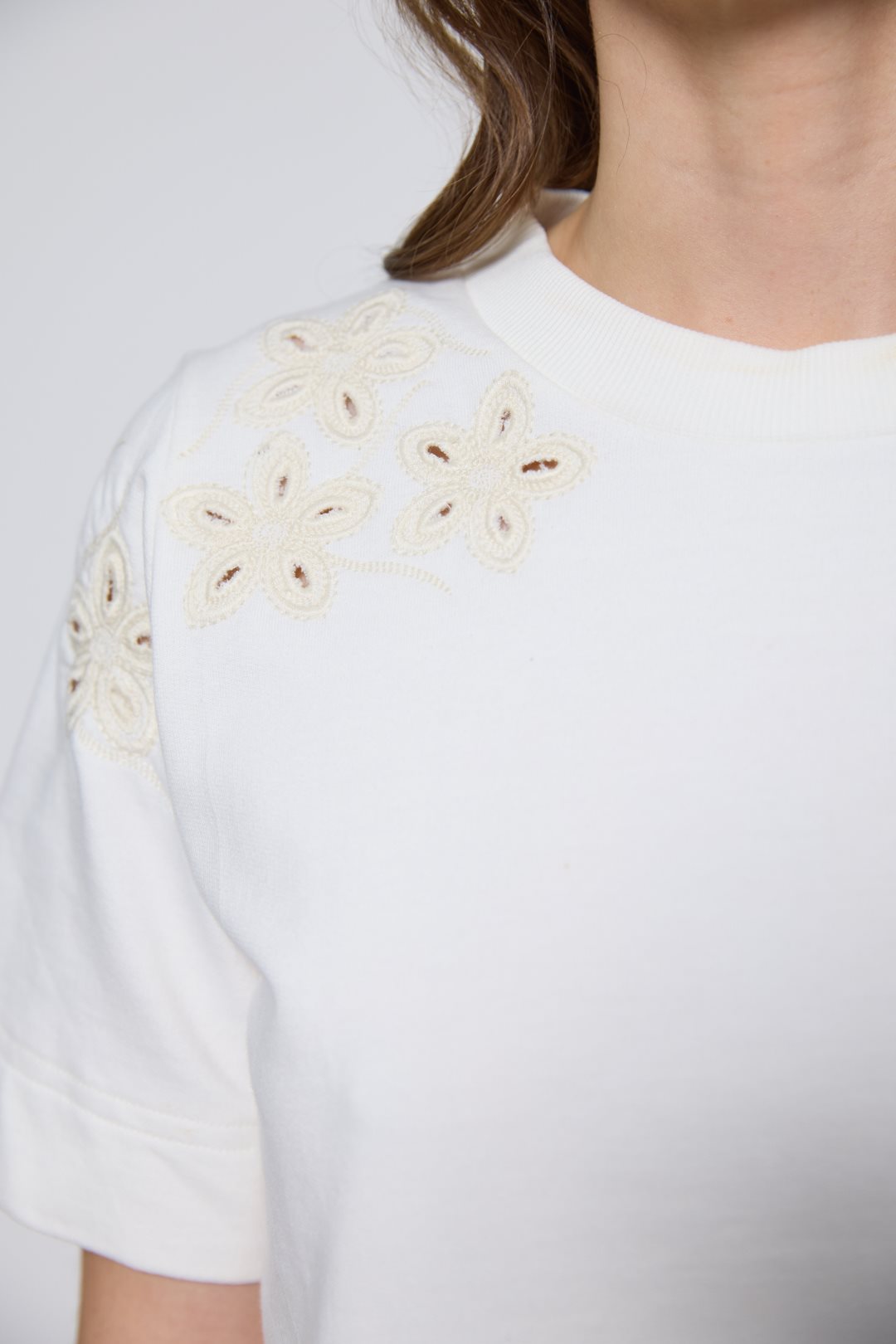 This cotton t-shirt combines a simple style with a delicate touch thanks to its soft cream-colored fabric, classic short sleeves, and a round neckline that frames the neck naturally, while the floral embroidery on the shoulders adds an elegant and discreet detail to the outfit.