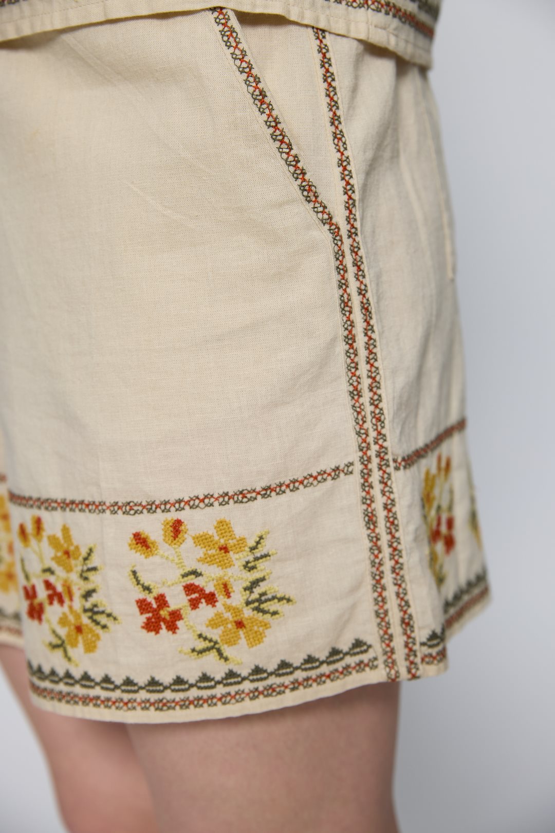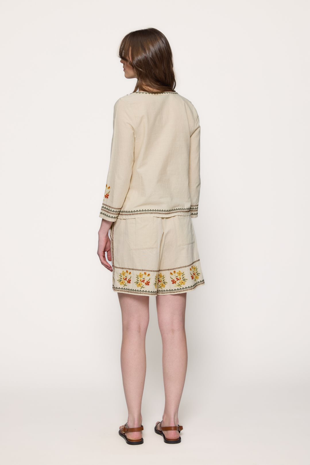 High-waisted shorts with a clean, structured waistband that flatters a flowing silhouette. Made from a natural-looking, rustic-feeling cotton and linen blend, they offer a cool and lightweight feel. The garment is particularly striking thanks to its embroidered hem, featuring a decorative border with folk-inspired floral motifs and geometric details along the edge. This ornamental pattern runs along the leg openings, breaking up the otherwise plain background and giving the shorts a distinctive, handcrafted, and summery feel.