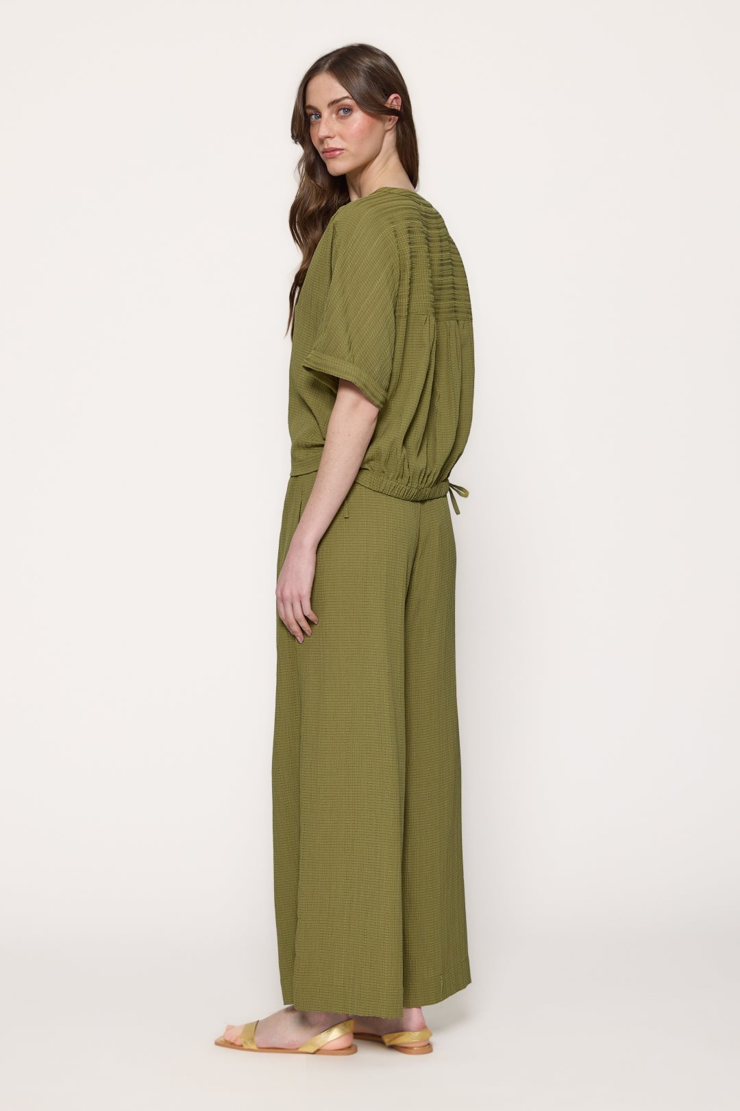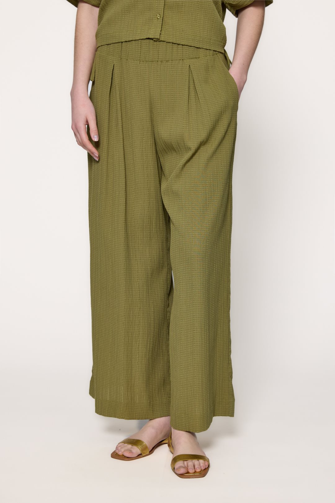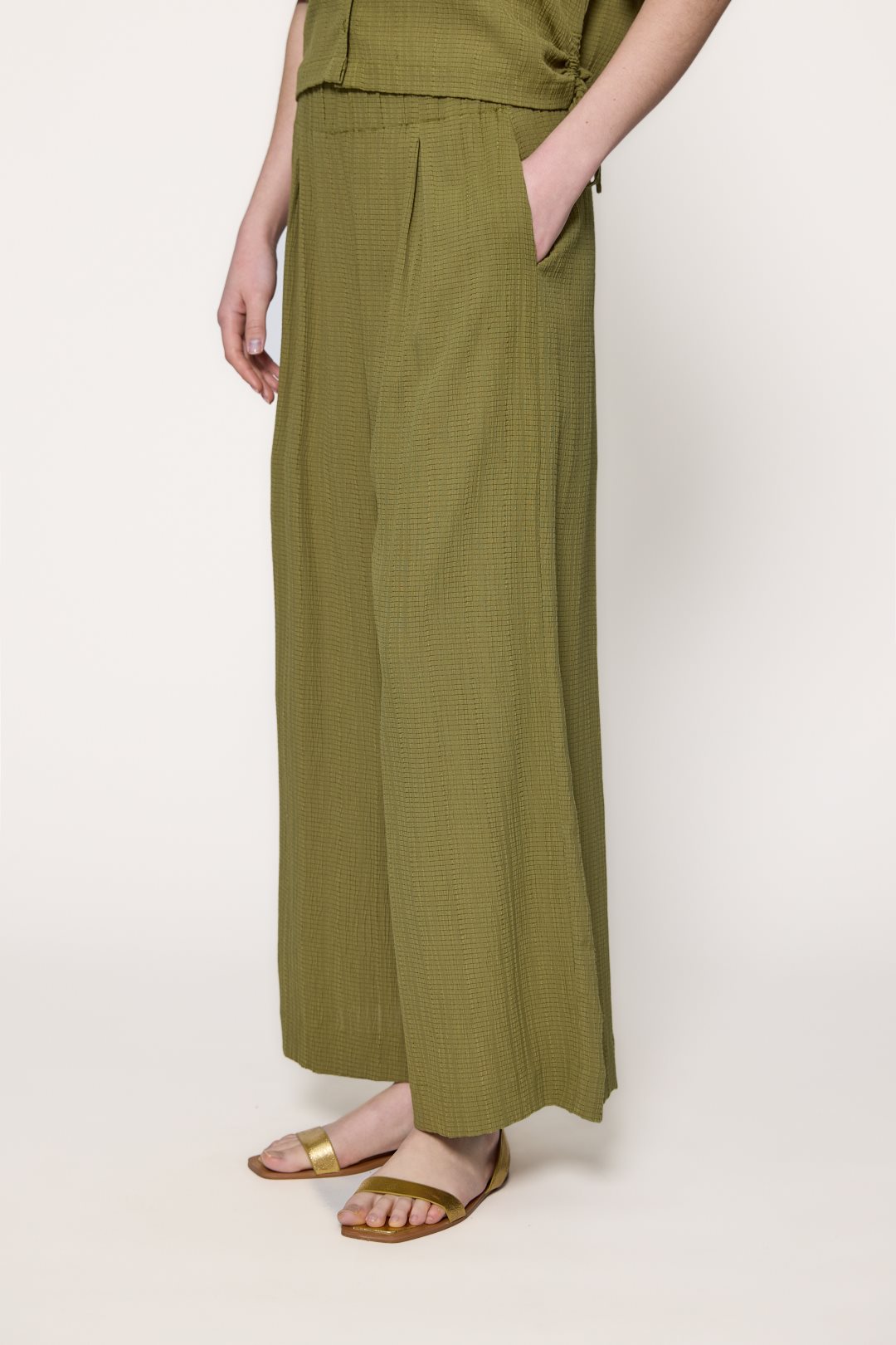 These wide-legged trousers feature a flowing silhouette with a culotte or palazzo cut, designed with a gathered elastic waistband for comfort and an adaptable fit. The structure incorporates front darts that add volume and an elegant drape from the hip. The fabric boasts a seersucker texture, characterized by a relief of fine vertical lines and a slightly crinkled appearance that lends a cool feel and body. The material’s tactile quality and natural drape make it ideal for relaxed yet sophisticated outfits.