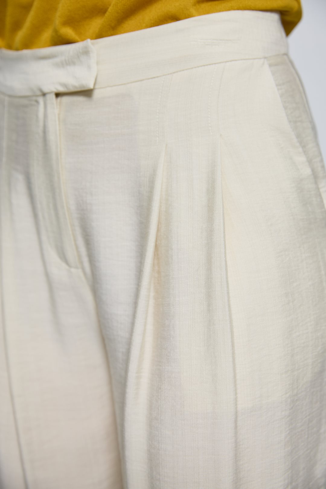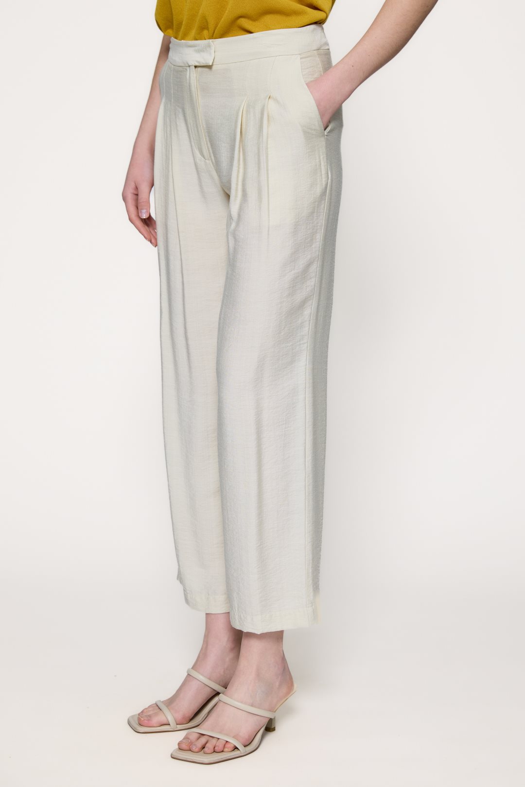These flowing trousers feature a wide, straight leg silhouette that allows for freedom of movement. They have a high waist with a concealed front placket for a clean finish. The fabric boasts a subtle sheen and a slightly satin texture with a fine-grained effect, giving it an elegant drape and a sophisticated feel. Deep front darts add volume and a classic structure to the garment.