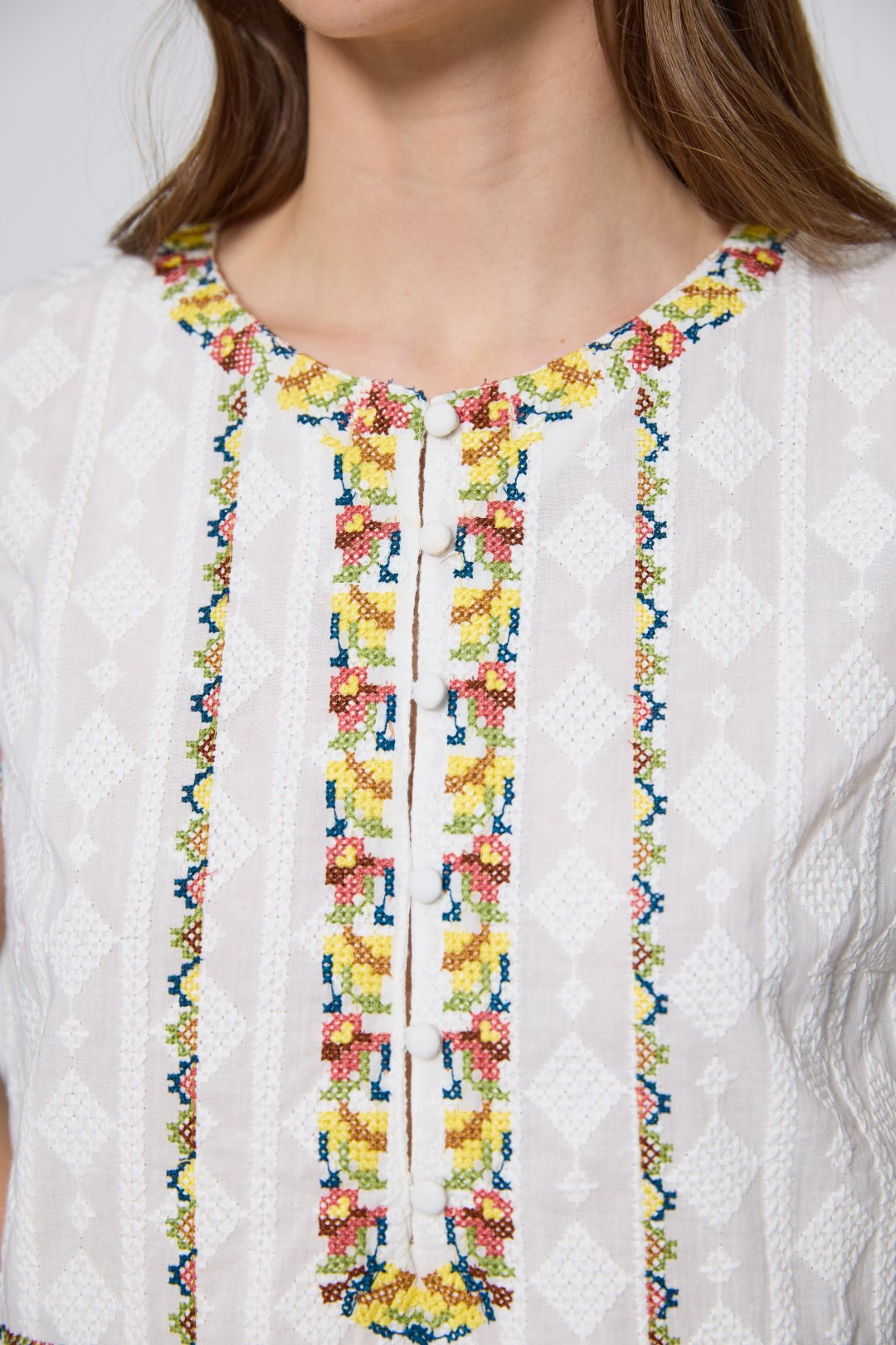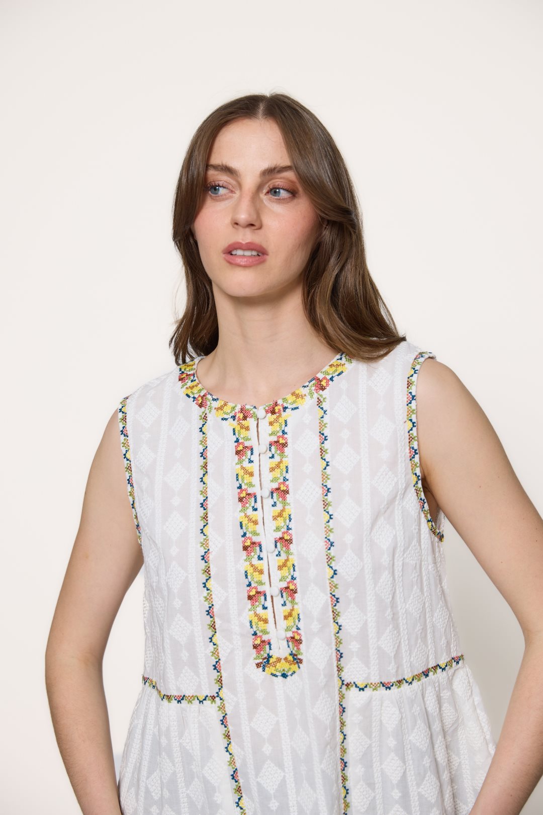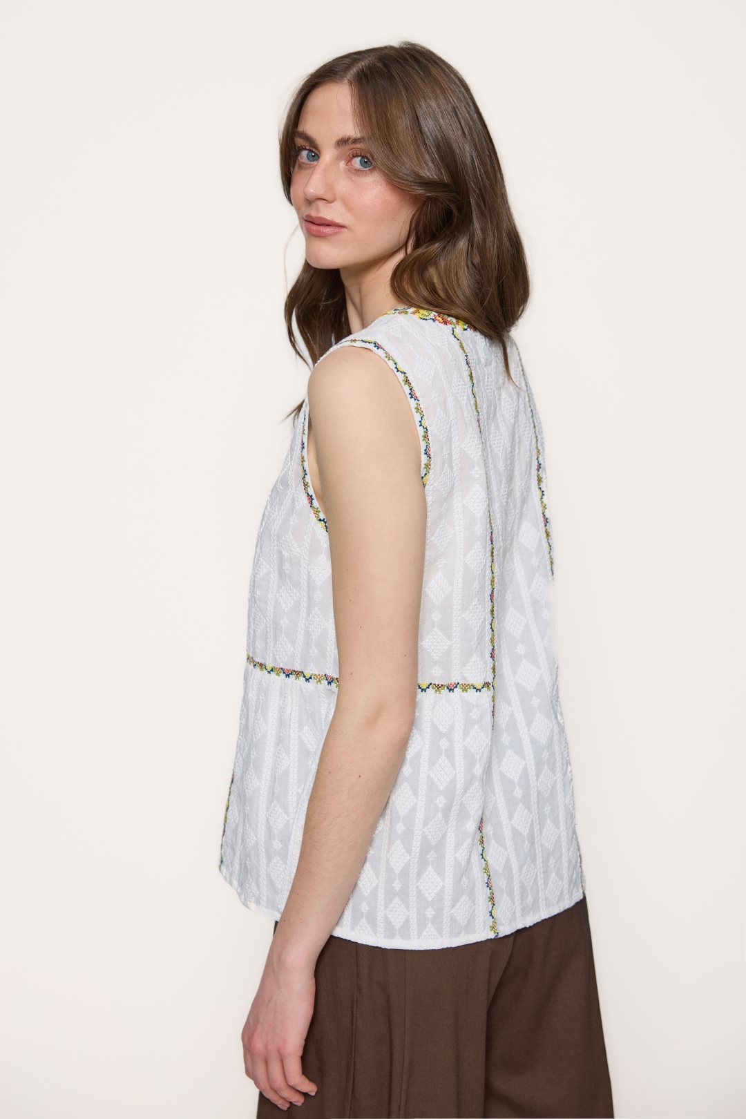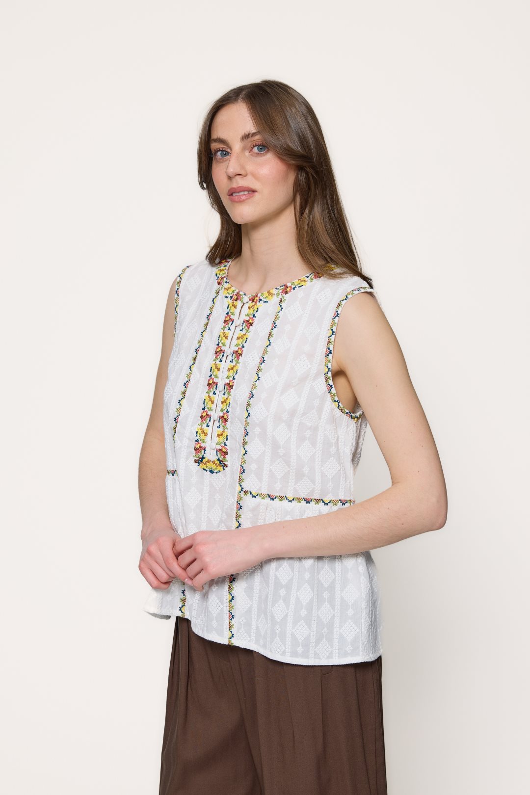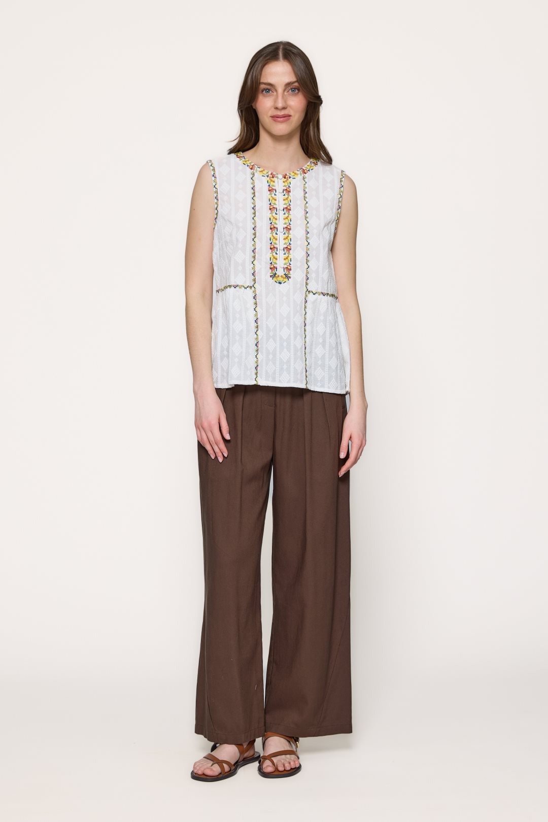 Blusa de 100% algodón destaca por su diseño de corte fluido y una textura ligera que sugiere frescura y comodidad. Presenta un cuello redondo con una sutil abertura central que se integra a una pechera decorada con intrincados bordados geométricos y florales, los cuales aportan un aire artesanal y bohemio a la prenda. Al carecer de mangas, su estructura de sisa abierta proporciona una gran libertad de movimiento, mientras que los detalles ornamentales se extienden a lo largo del torso y la cintura, definiendo la silueta de manera delicada y femenina.