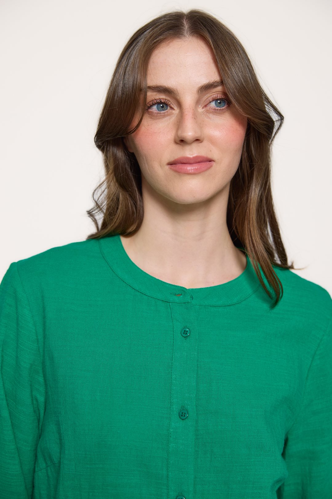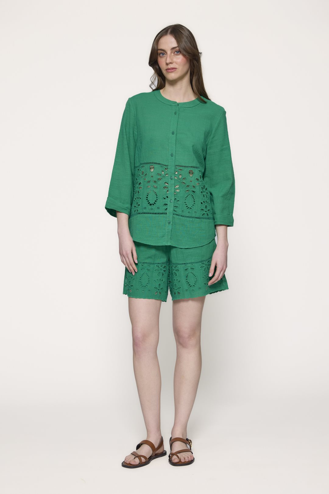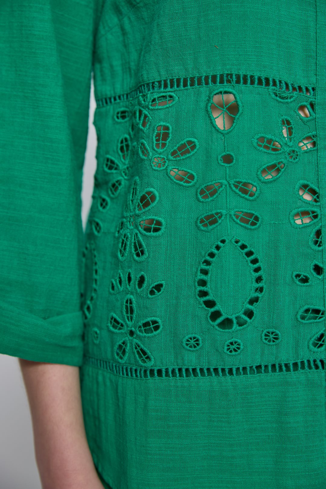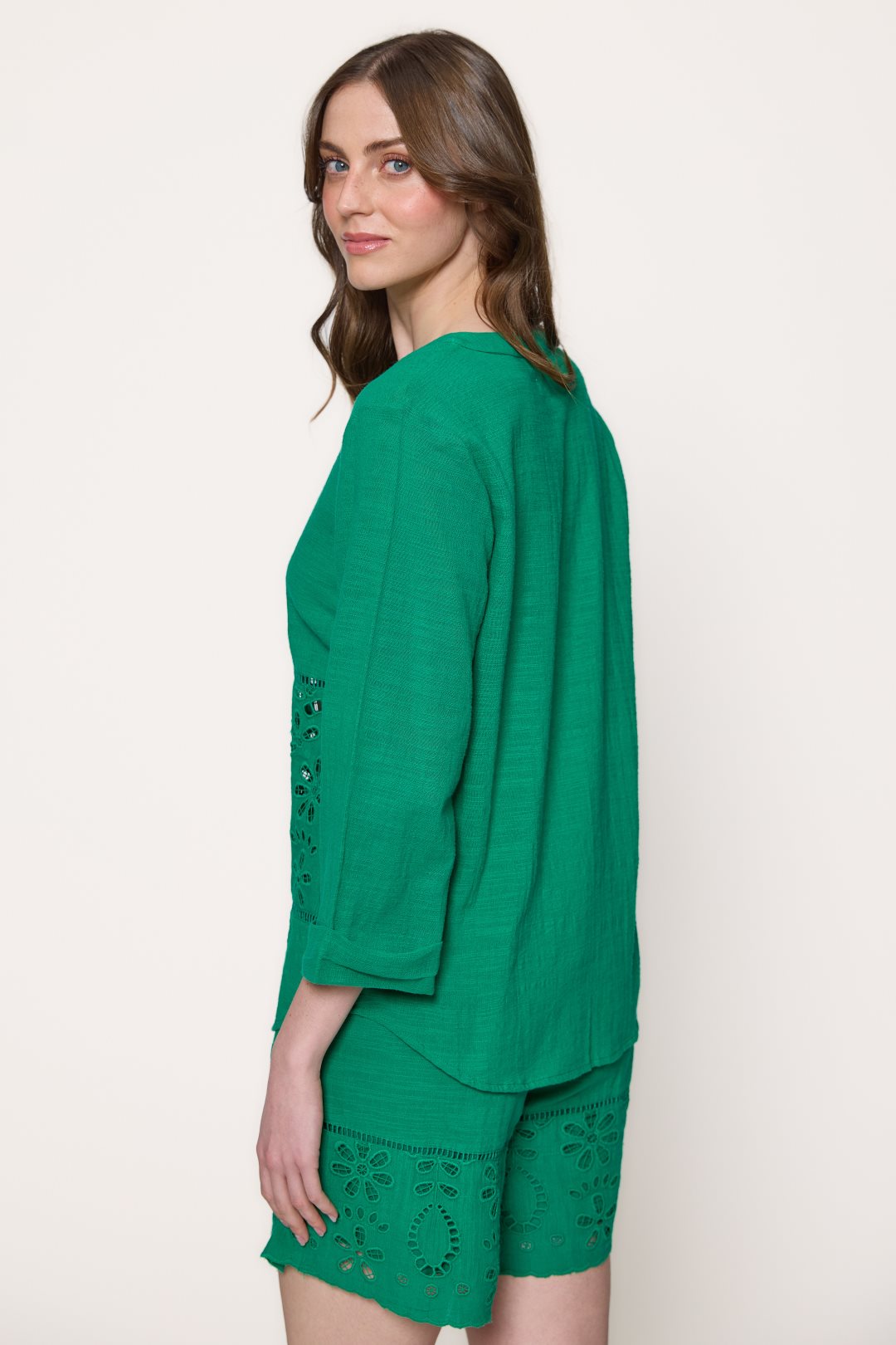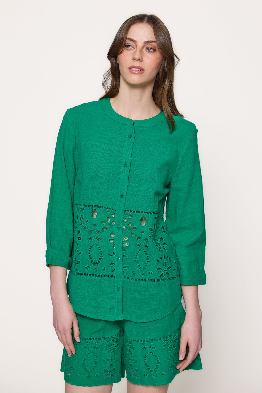 Blusa de algodón, ideal para un estilo casual y artesanal. Su diseño se distingue por un sencillo cuello redondo de estilo mao, el cual está desprovisto de solapas, y se extiende en una botonadura frontal completa con pequeños botones. Las mangas son de largo tres cuartos, una longitud muy práctica que finaliza por debajo del codo, ofreciendo un equilibrio perfecto entre cobertura y frescura que complementa el elaborado detalle de bordado floral calado en el panel inferior de la prenda.