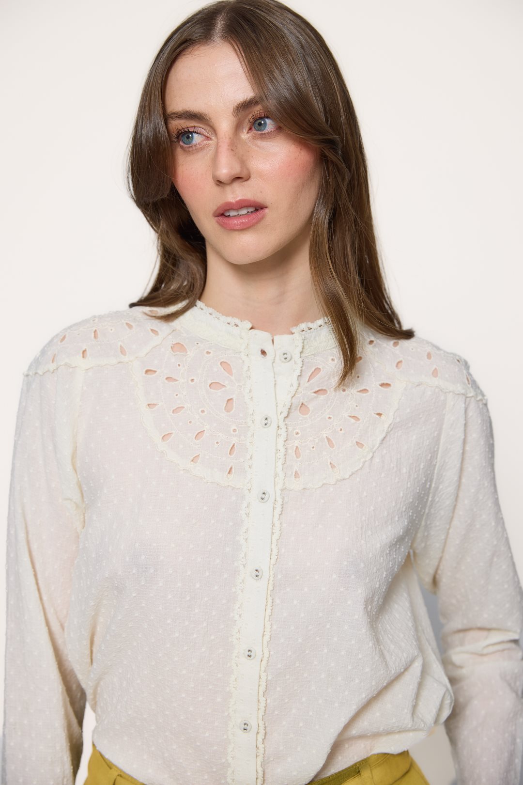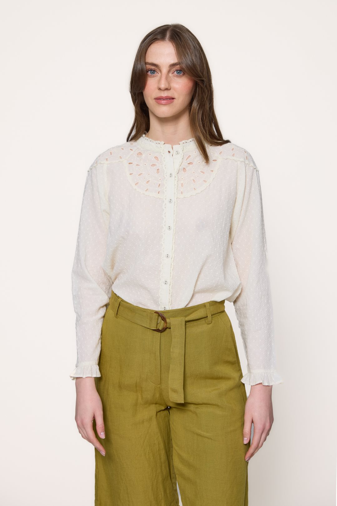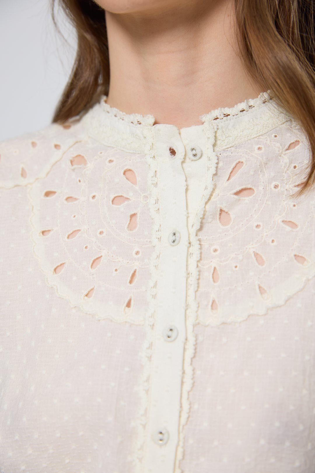 Blusa de 100% algodón destaca por su tejido de plumeti y su aire romántico lleno de detalles delicados. Presenta un cuello redondo de estilo mao con un pequeño acabado en ondas que se une a una botonadura frontal completa. El diseño resalta por su canesú adornado con bordado suizo y calados florales que aportan una sutil transparencia en la parte superior. Las mangas son de largo completo y finalizan en unos puños con pequeños volantes, lo que refuerza la estética femenina y clásica de la prenda.