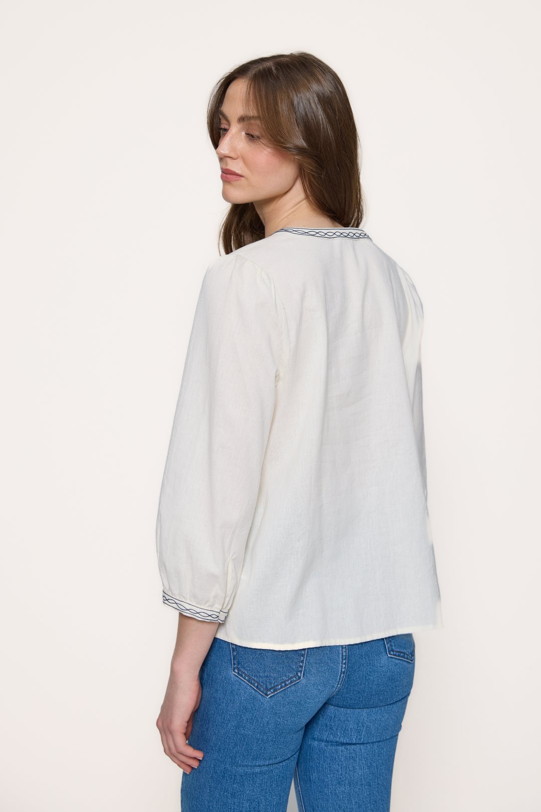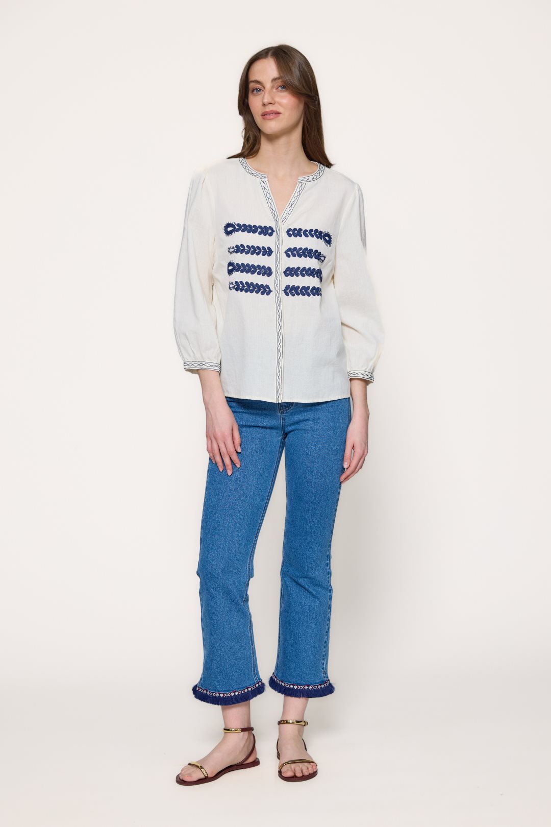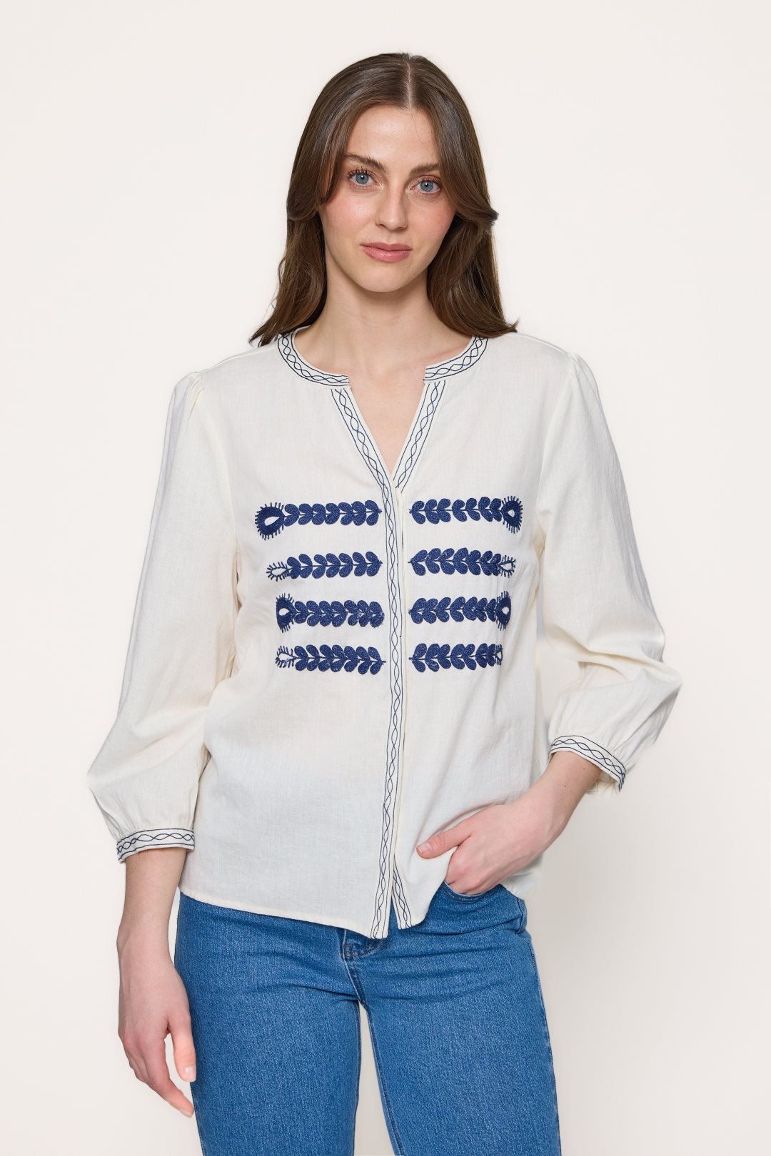 Blusa confeccionada en una mezcla de algodón y lino combina la suavidad con la frescura y estructura característica de estas fibras naturales. Presenta un elegante cuello de estilo mao que se abre en un favorecedor escote en V, todo ello enmarcado por delicados bordados en contraste que recorren la abertura frontal. Las mangas son de largo tres cuartos, con un ligero diseño abullonado que se ajusta en los puños, los cuales también incorporan detalles bordados para armonizar con el patrón ornamental de inspiración militar en el torso.
