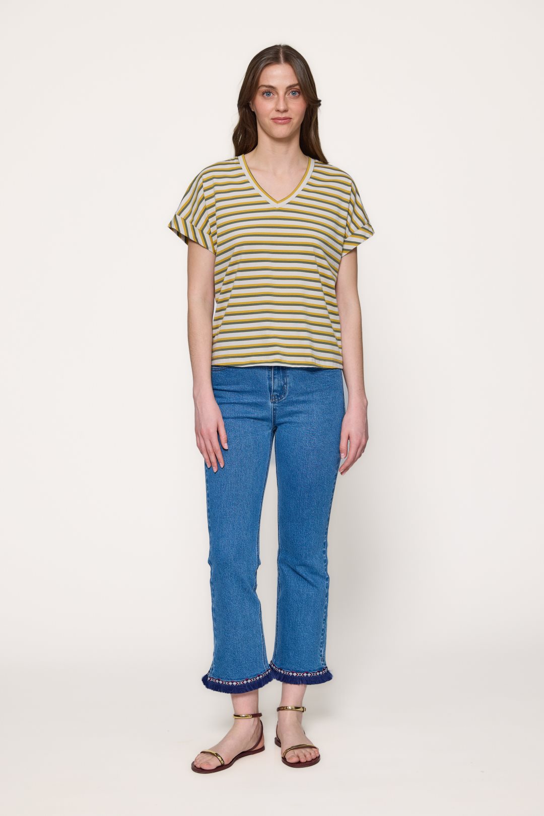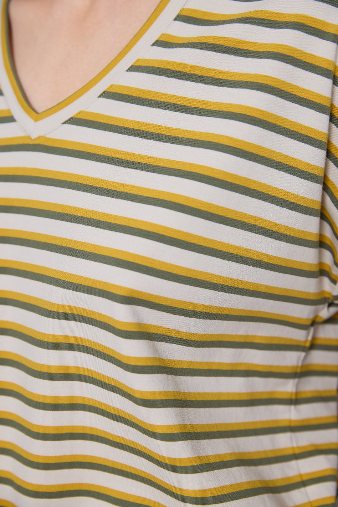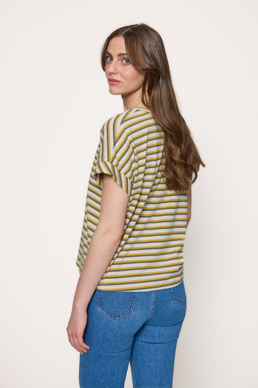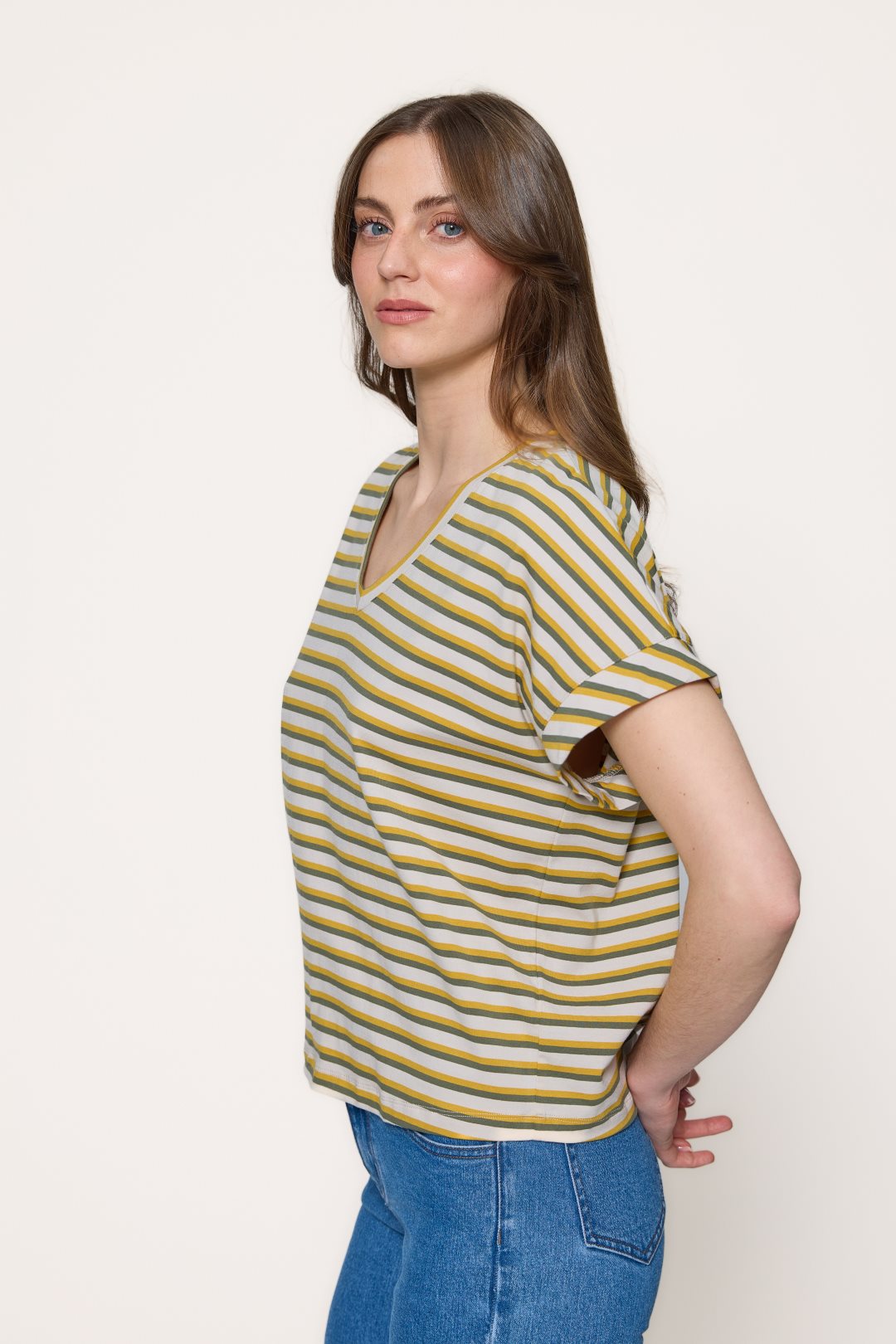 Camiseta de corte relajado destaca por su estampado de rayas horizontales en tonos mostaza y gris, un favorecedor escote en V y mangas cortas con vuelta, todo confeccionado en un cómodo tejido de algodón con elastano que aporta suavidad y flexibilidad.