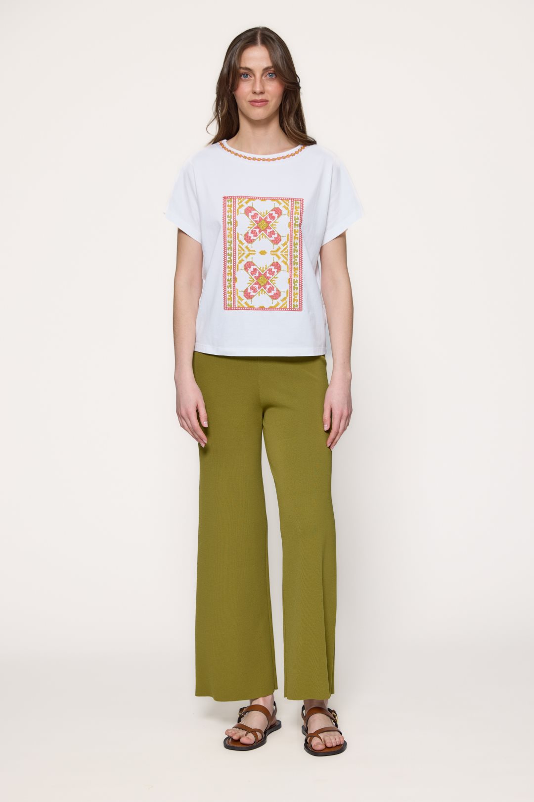 Pantalón largo de punto de viscosa y poliamida presenta una caída fluida y un estilo relajado, con un diseño de pierna amplia que aporta comodidad y movimiento, mientras su longitud hasta el tobillo refuerza un aire desenfadado y versátil ideal para looks cotidianos.