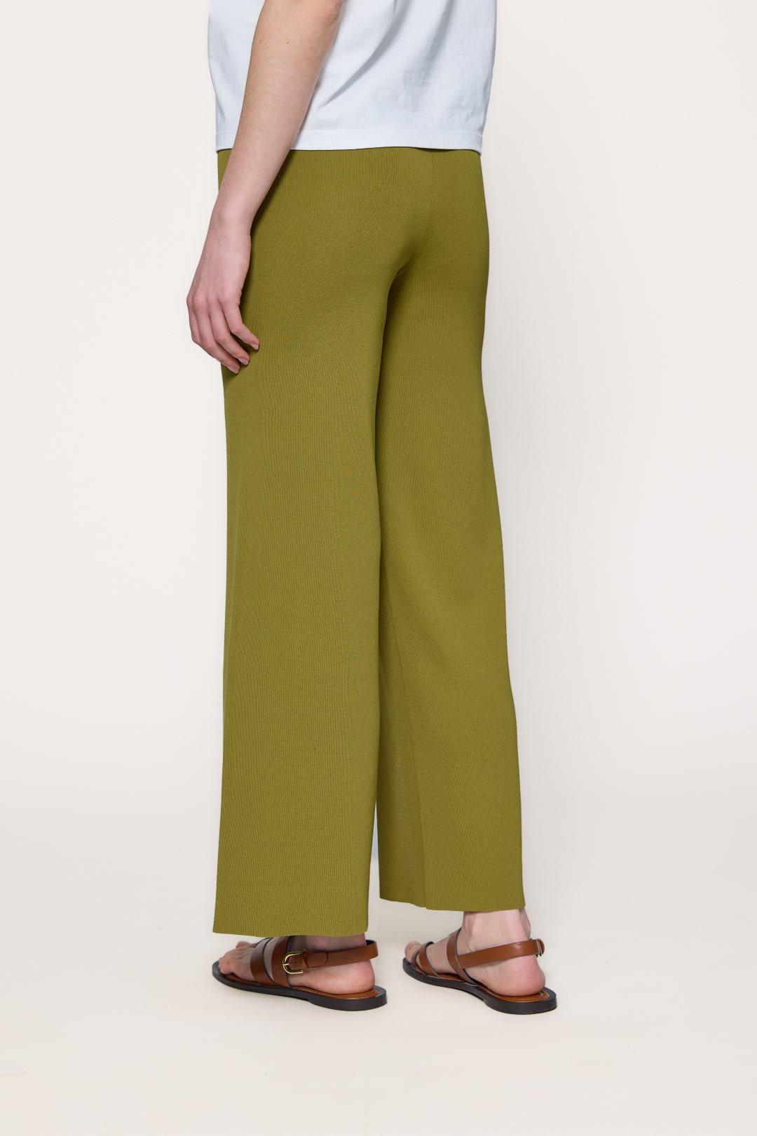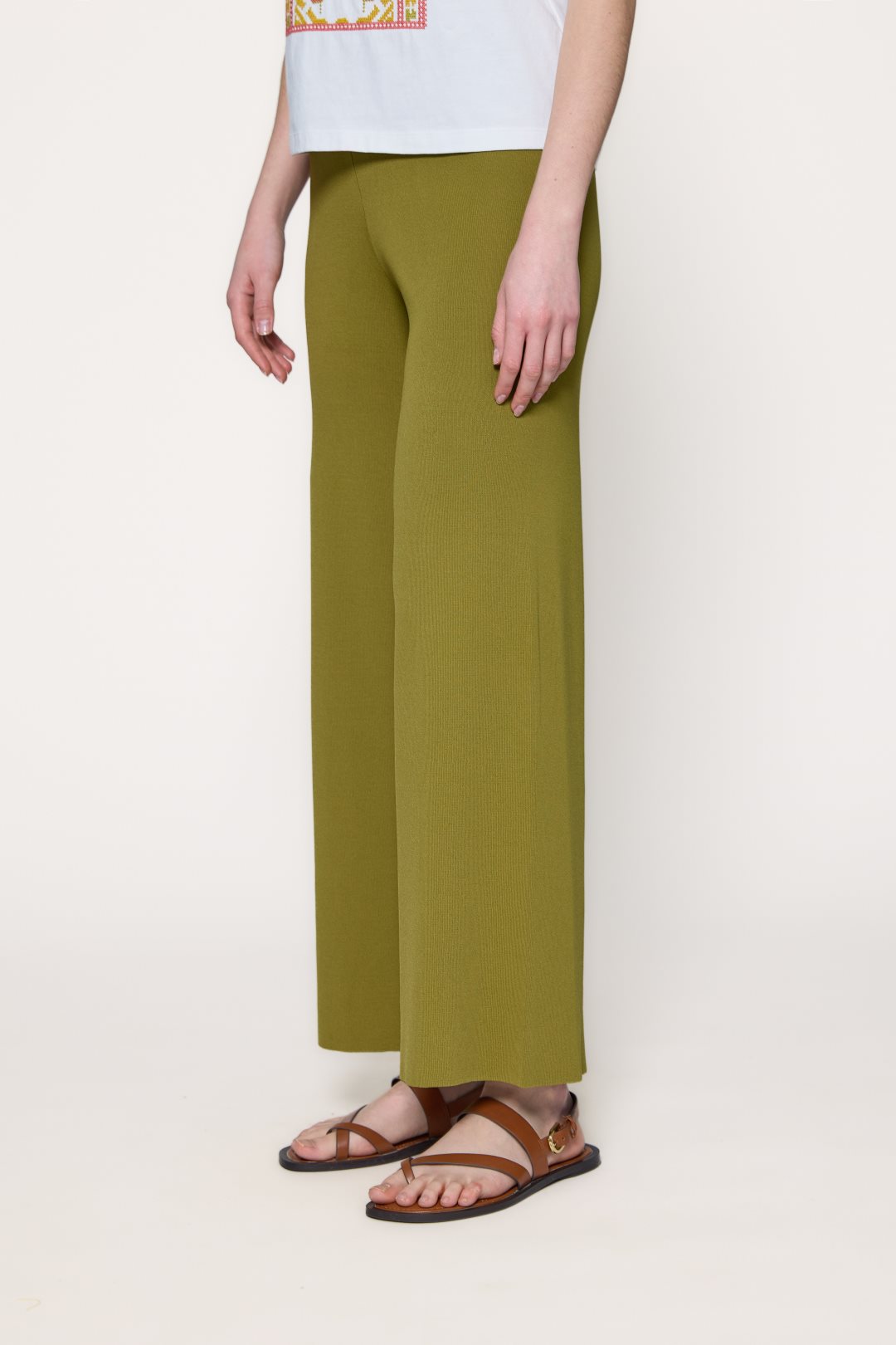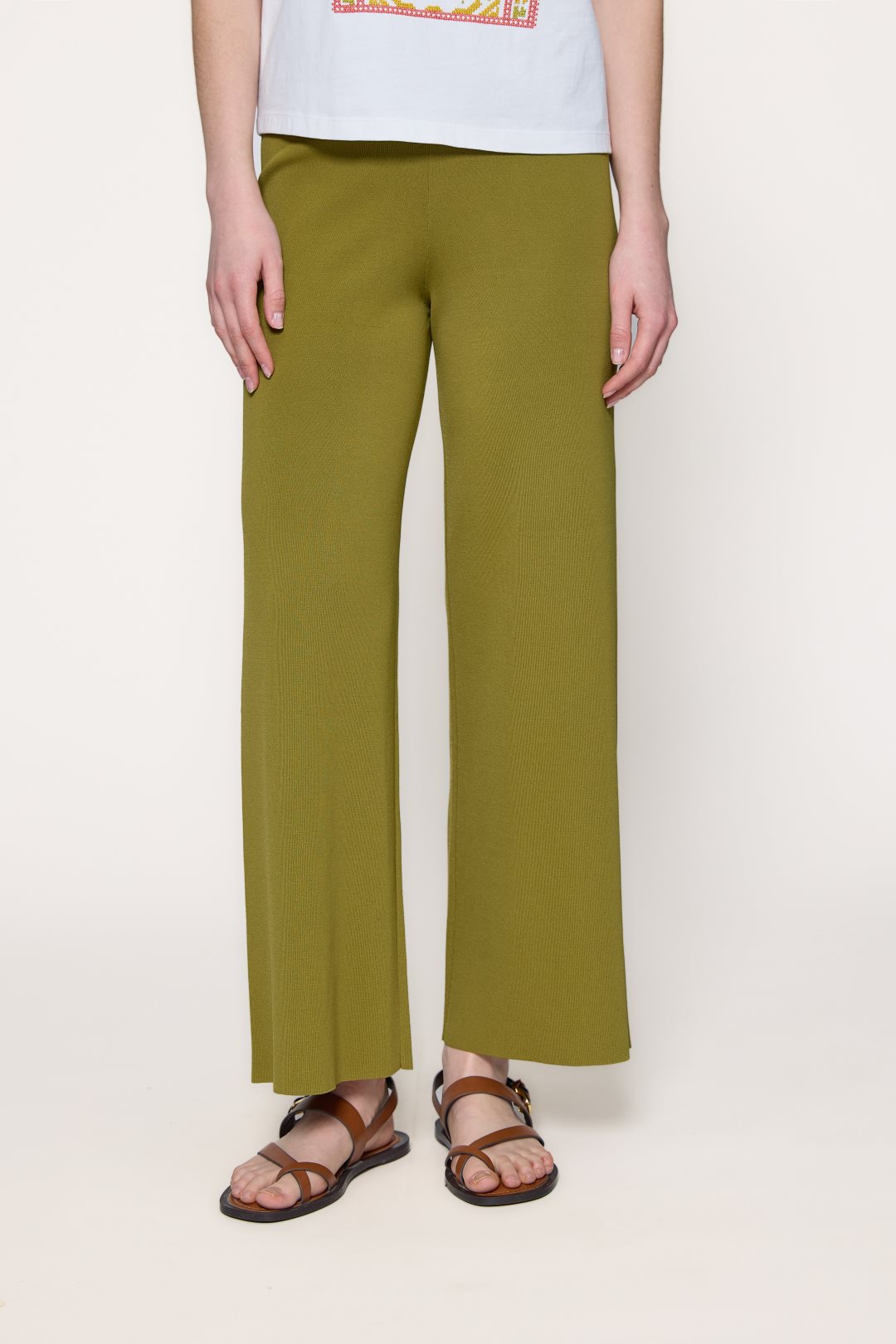 Pantalón de punto de estilo relajado y caida fluida con pierna ancha.