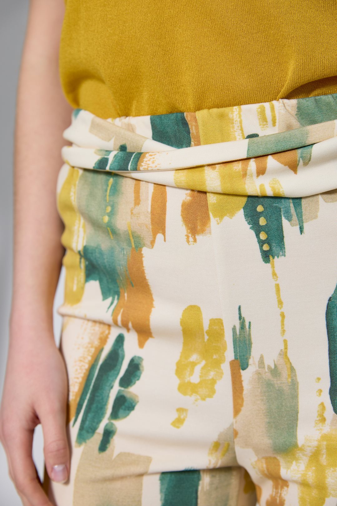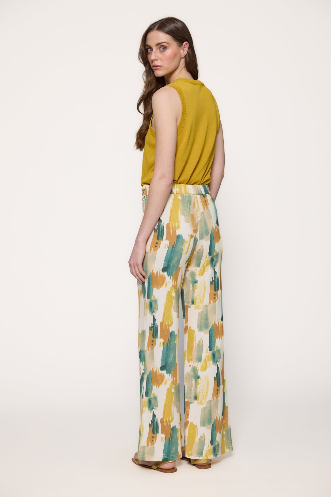 Pantalón largo de punto de viscosa y poliéster destaca por su caída fluida y su estilo relajado, con un diseño de pierna amplia que aporta movimiento y comodidad, mientras su longitud refuerza un aire versátil y desenfadado perfecto para looks cotidianos.
