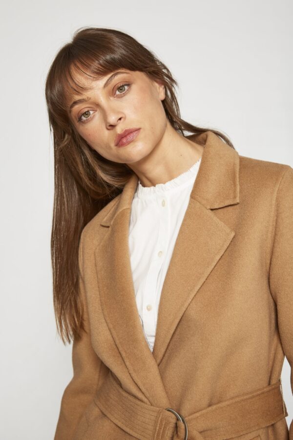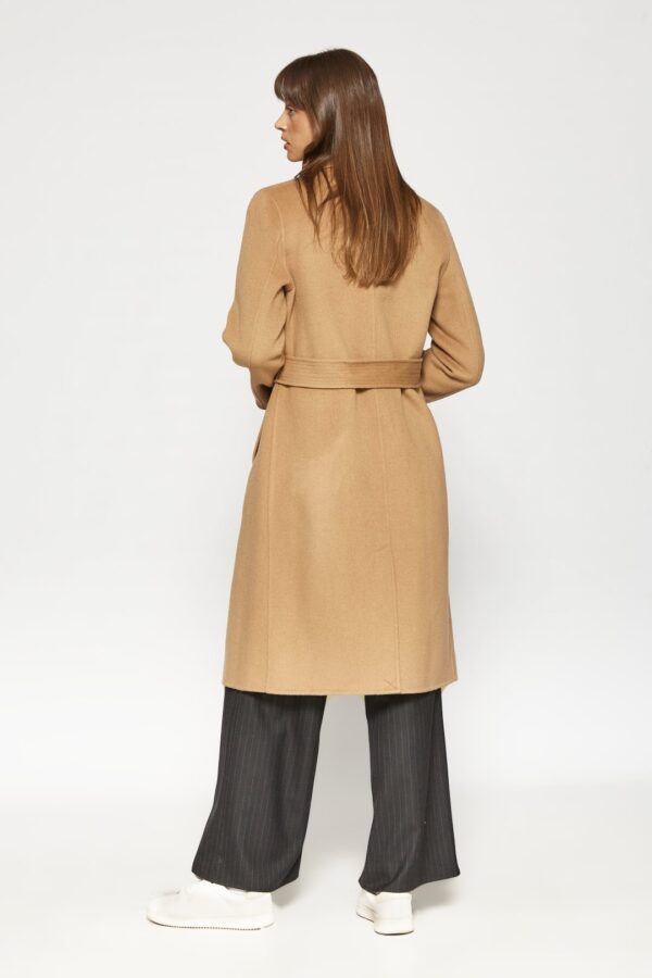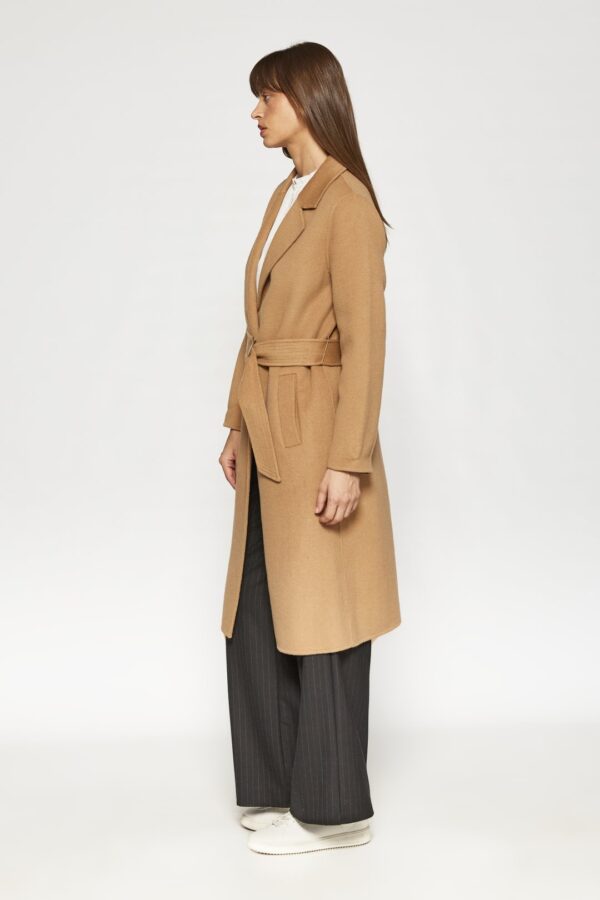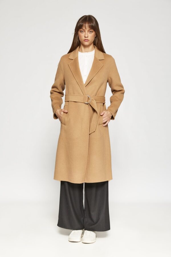 Este elegante abrigo largo está confeccionado en un tejido liso que aporta suavidad y una caída fluida, ideal para entretiempo y frío. Presenta solapas amplias y un cuello estructurado, con un cinturón ancho a juego que permite ajustar la silueta mediante un nudo envolvente. Los bolsillos laterales se integran discretamente en las costuras para mantener una línea limpia. Las mangas largas y el corte recto hasta la rodilla o por debajo ofrecen una cobertura elegante y versátil, perfecta para complementar tanto looks formales como casuales, aportando un toque de refinamiento.