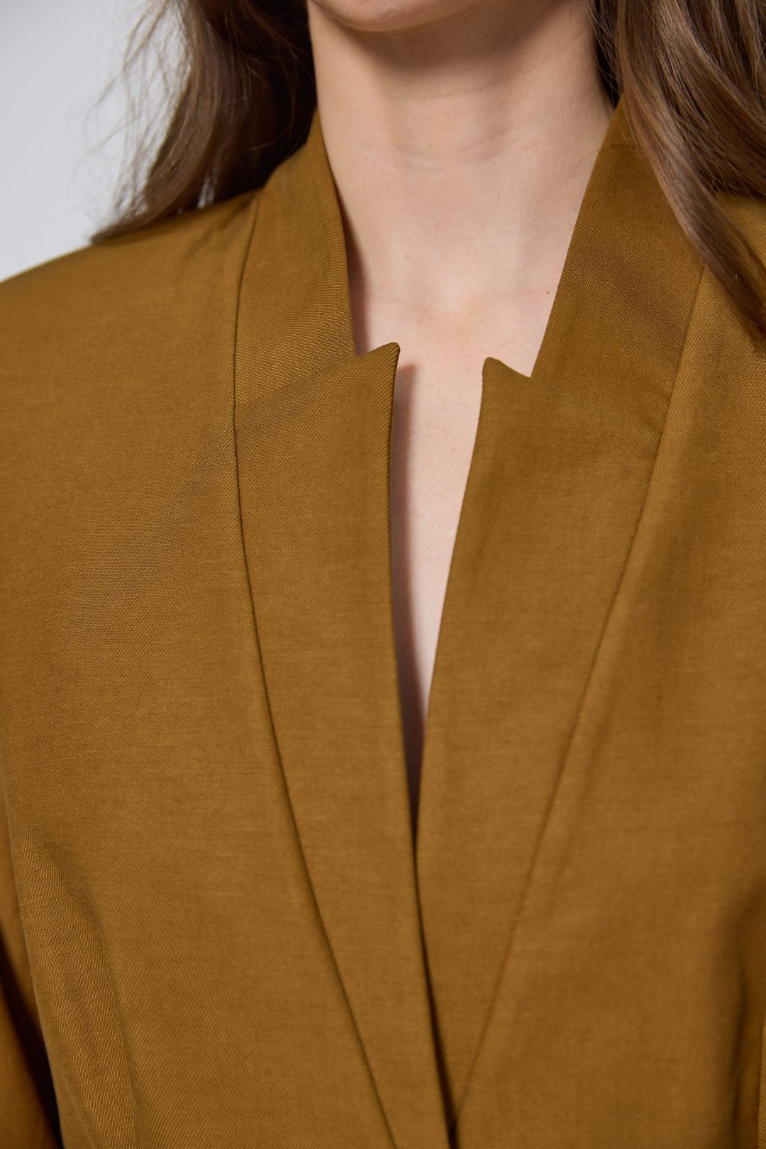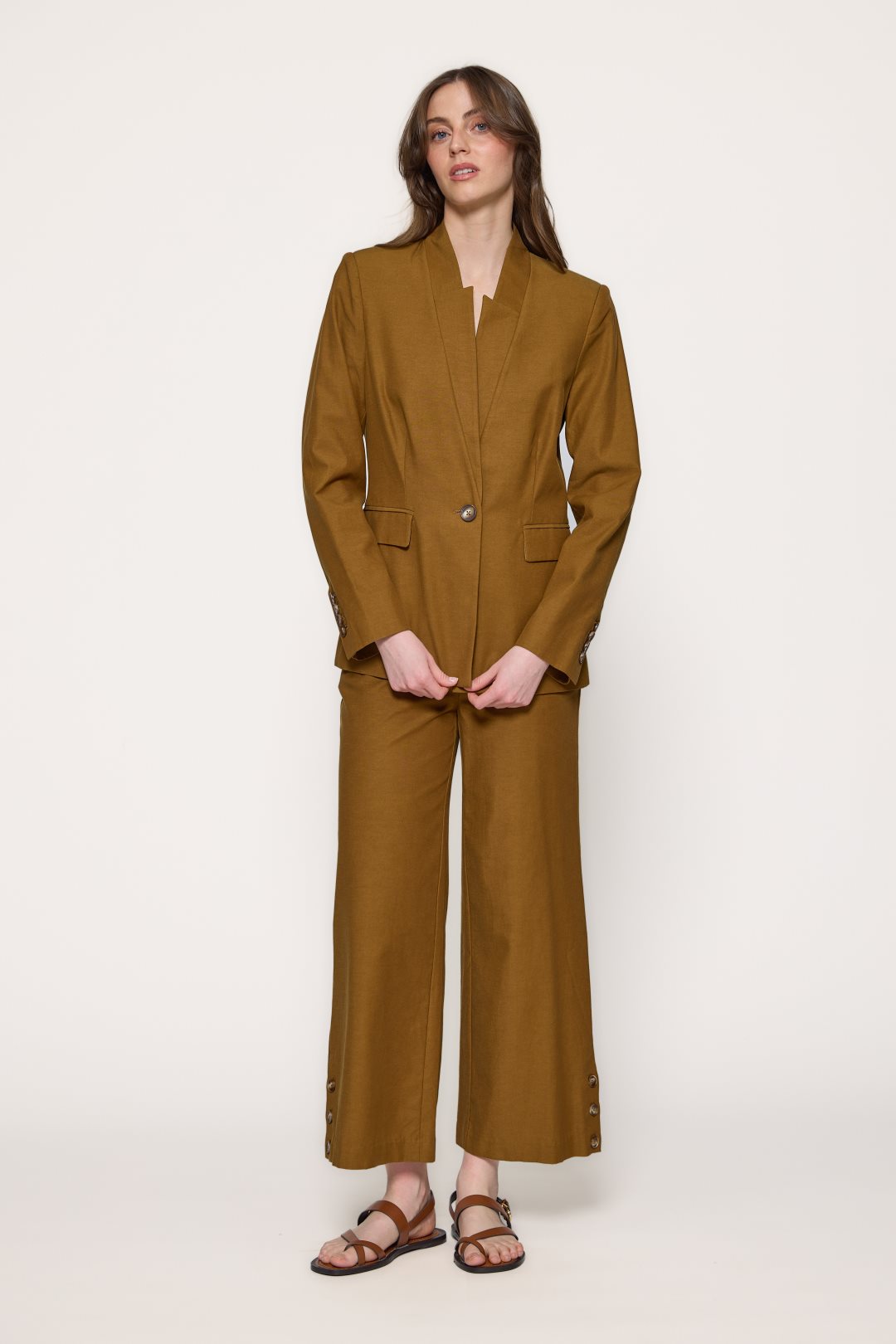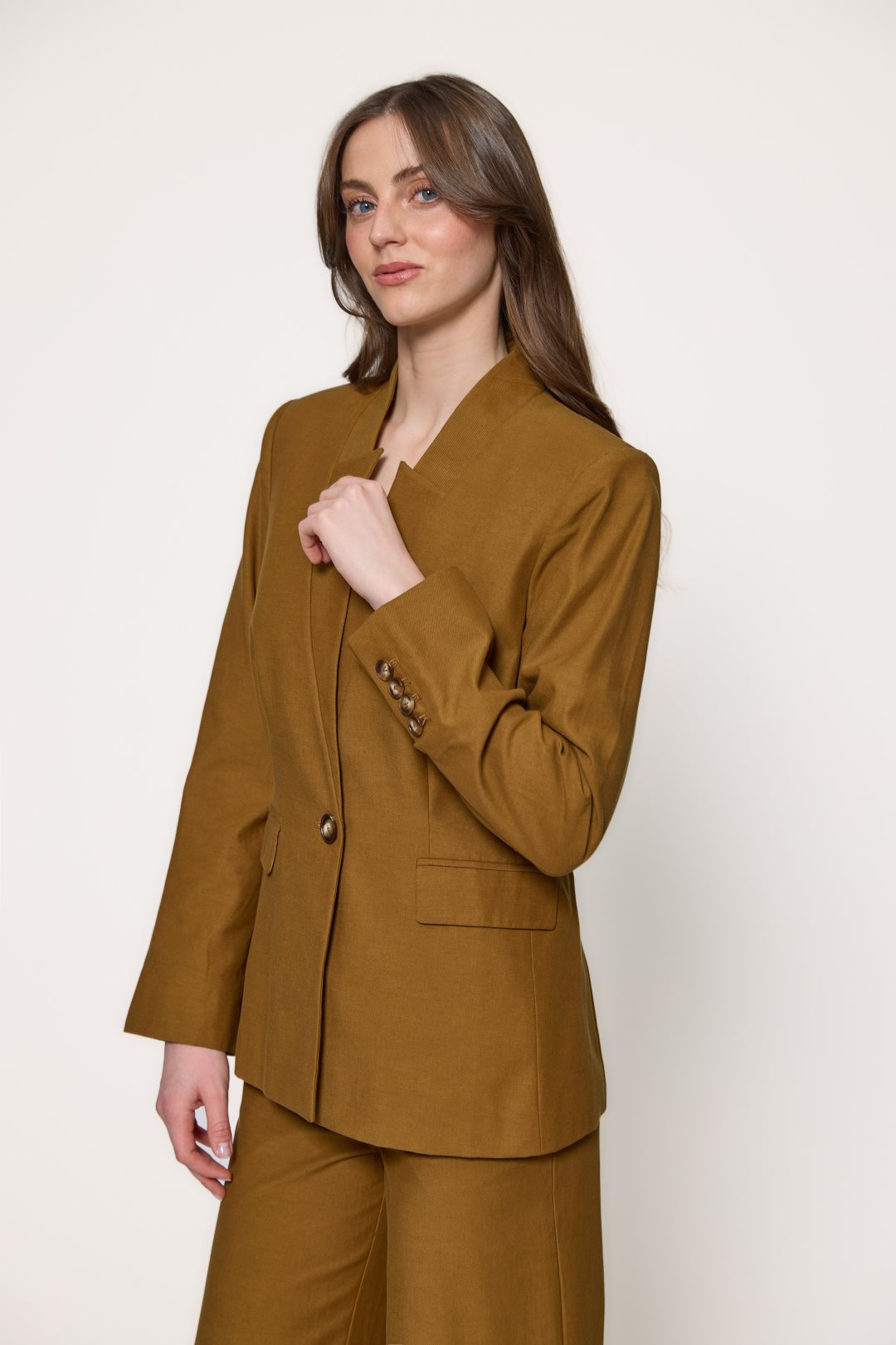 Americana se define por un cuello con solapas de muesca clásicas que enmarcan un escote en V profundo, cerrándose en la parte central mediante un único botón. Presenta mangas largas de corte recto y estructurado que refuerzan su silueta formal y profesional. El tejido posee una textura visible y ligeramente rugosa de lyoncel y algodón, aportando cuerpo a la prenda sin perder ligereza. Además, el diseño incluye dos bolsillos laterales con solapa y un forro interior satinado que garantiza un mejor ajuste y comodidad.