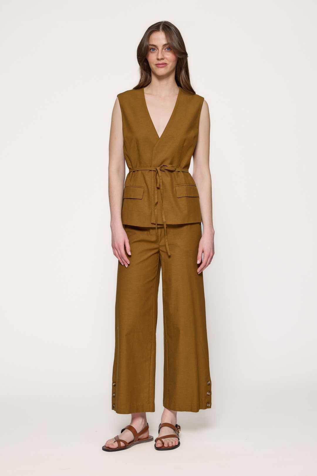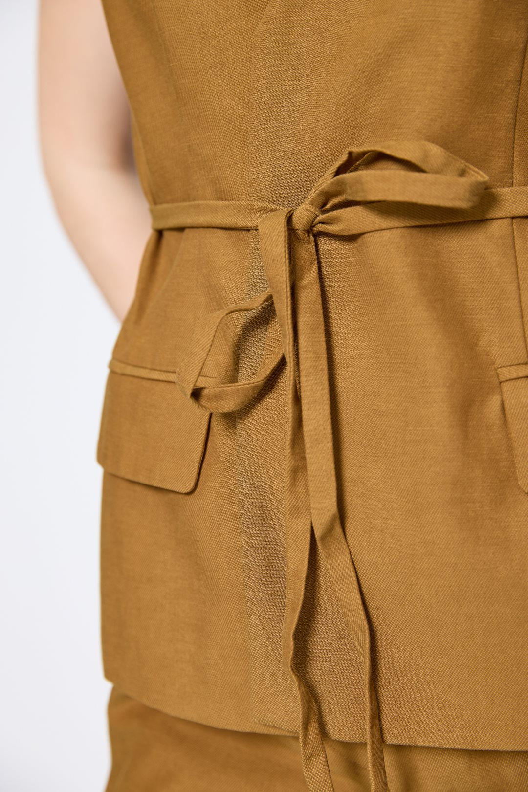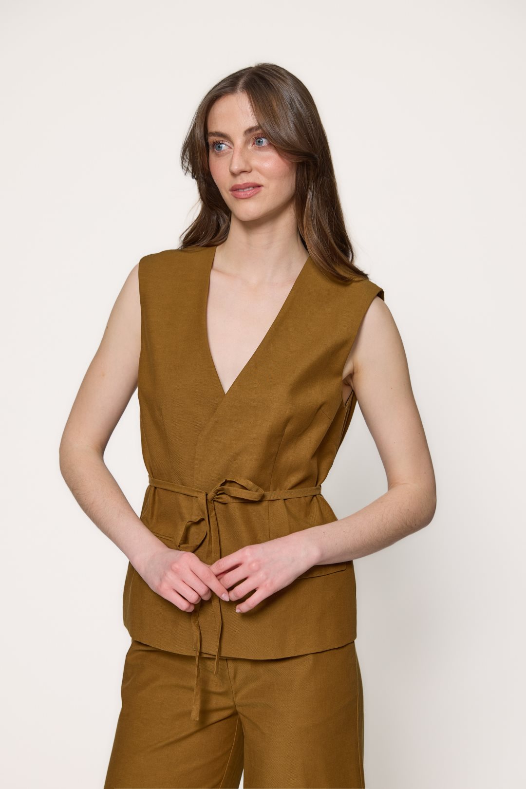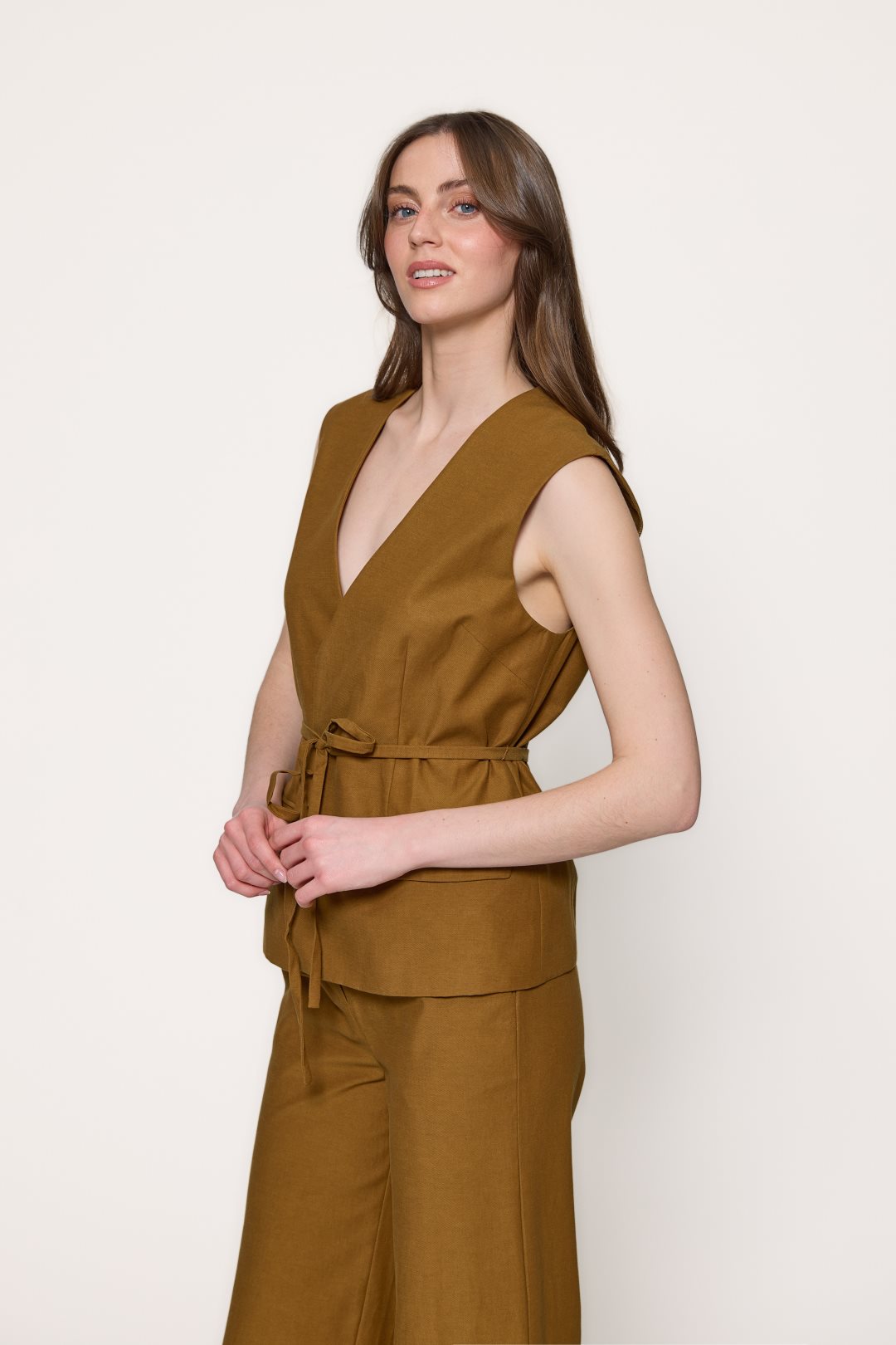 Blusa, con un diseño que recuerda a un chaleco, presenta un pronunciado cuello en V que baja hasta la cintura, donde se cierra de forma sutil. Es un modelo sin mangas, con sisas limpias que dejan los hombros al descubierto. Está confeccionada en un tejido de aspecto natural y con textura, de lyoncel y algodón, que le aporta estructura y un tacto agradable. Cuenta con un cinturón fino del mismo material que se anuda en la parte delantera, frunciendo ligeramente la prenda y definiendo la silueta. Además, incorpora dos bolsillos de solapa a los lados, añadiendo un toque funcional y clásico.