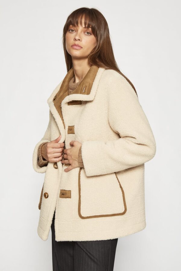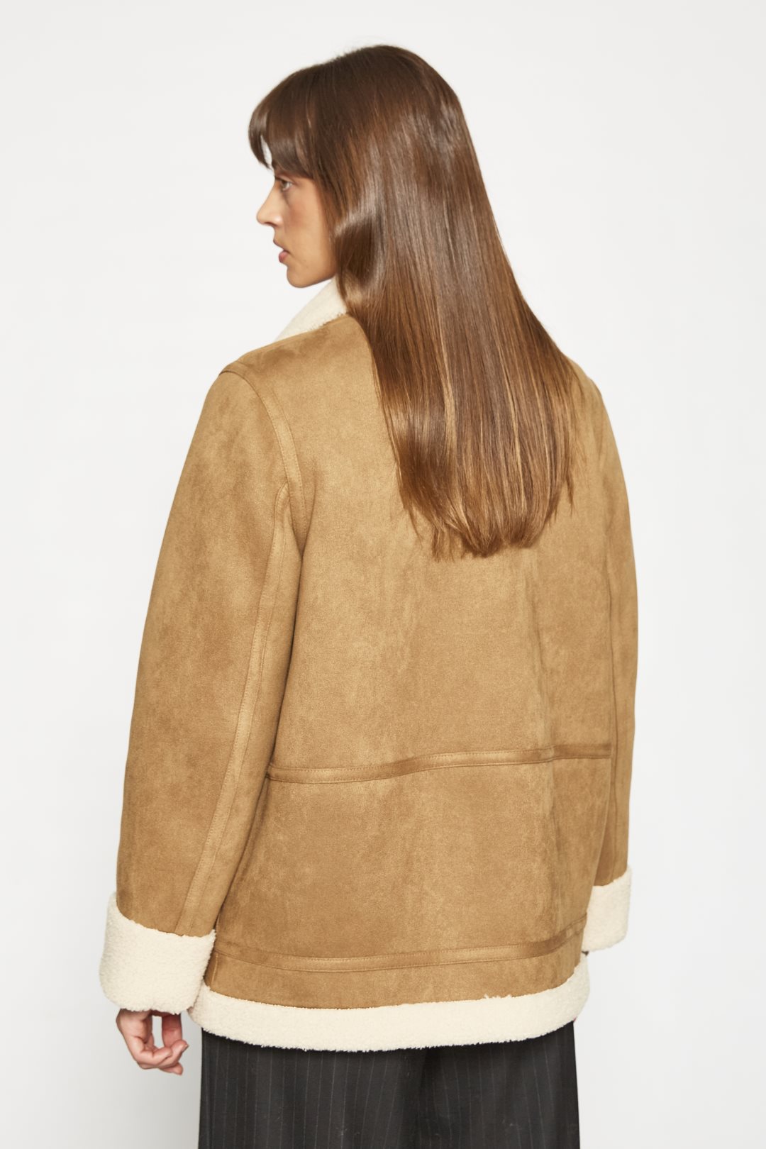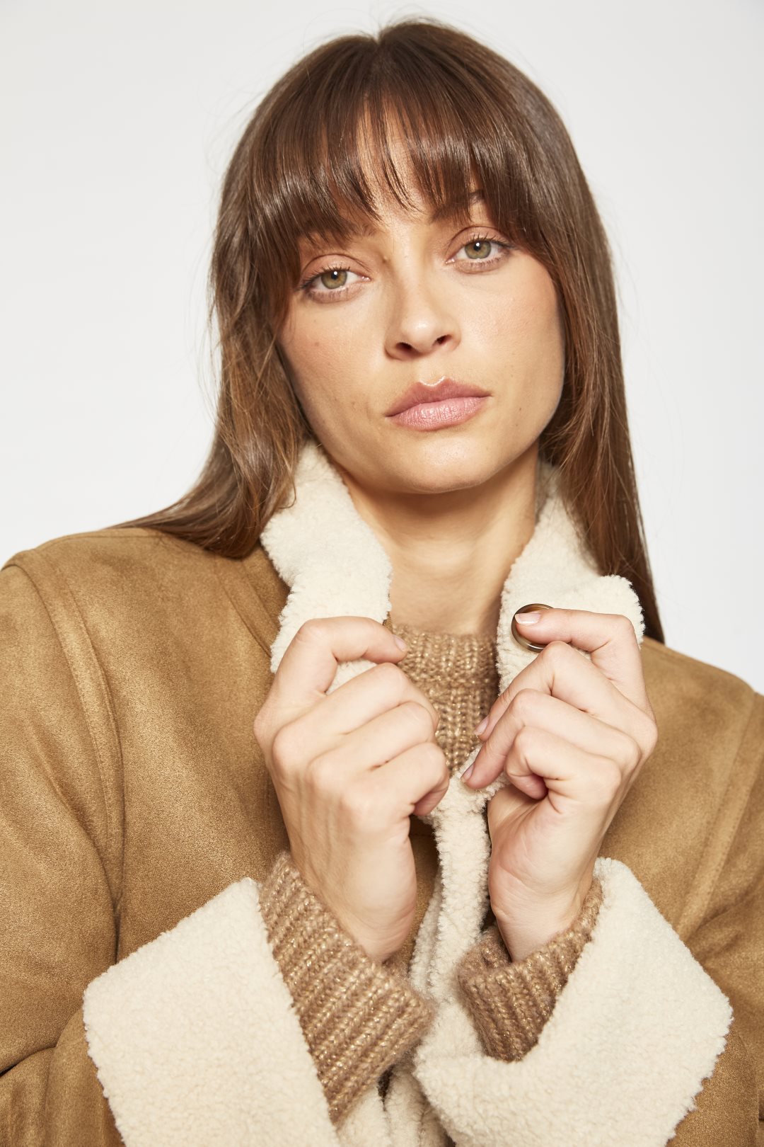 Chaquetón reversible que combina un exterior que imita el ante o la gamuza con un forro interior de borrego sintético o sherpa, aportando calidez y textura acogedora. Presenta un cuello amplio con solapas abrochables y cierre frontal con botones de estilo rústico. Los detalles de borrego se aprecian en el cuello, puños, bajo y tapeta de botones, generando un contraste visual. Incorpora bolsillos de parche o con ribete en la parte delantera. Mangas largas y corte recto con largo a la cadera o ligeramente por debajo. Prenda versátil que aporta estilo desenfadado y sofisticación.