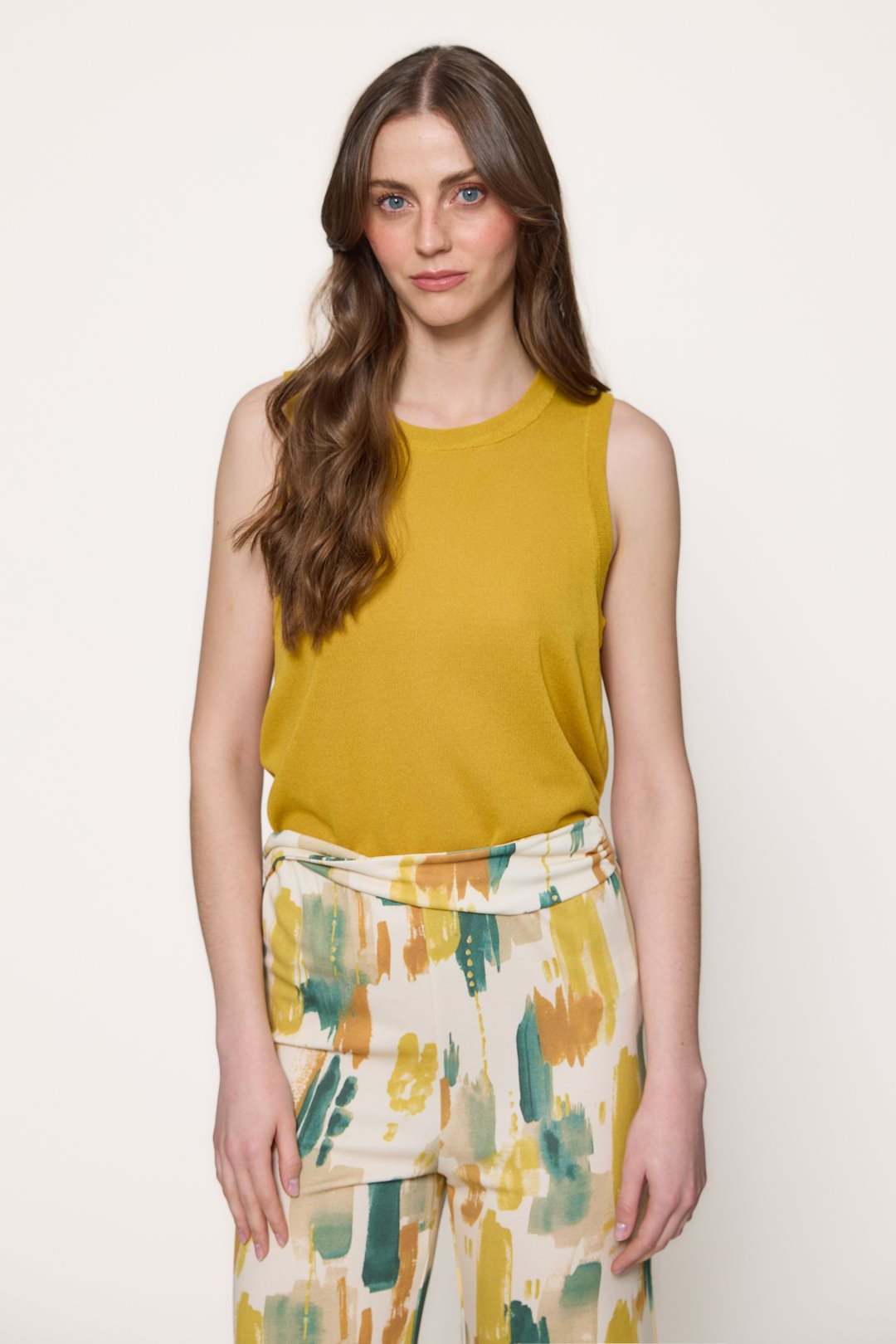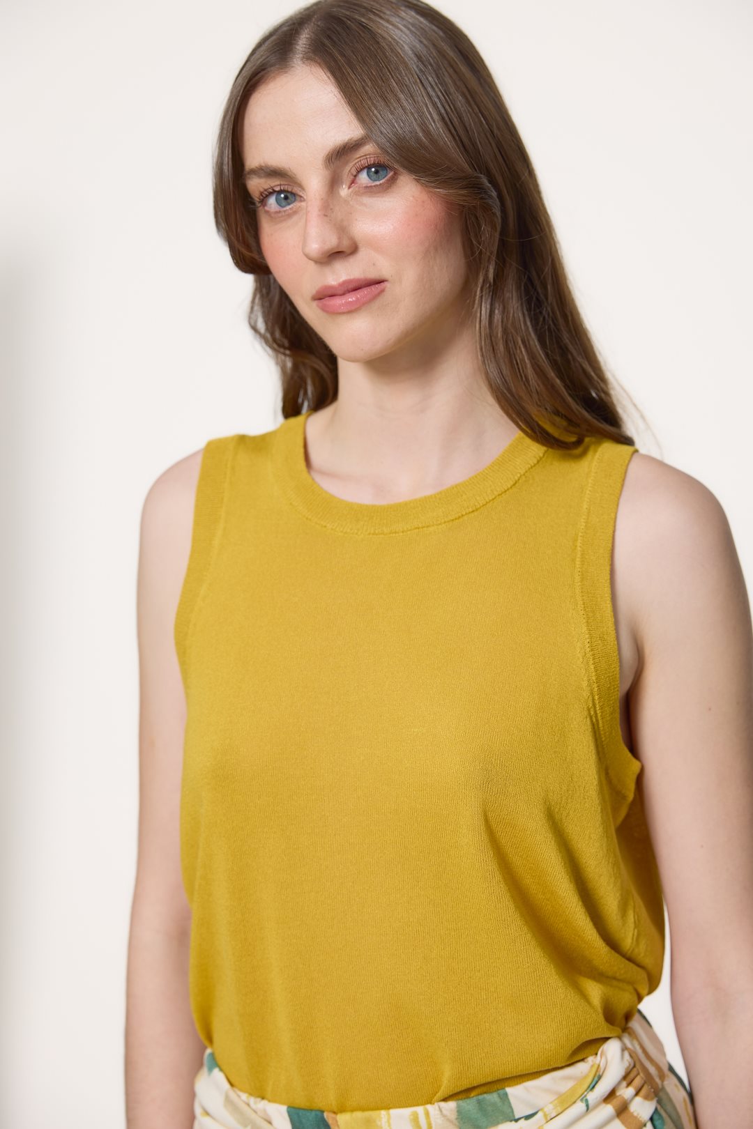 Jersey sin mangas de punto fabricado en viscosa y poliamida.