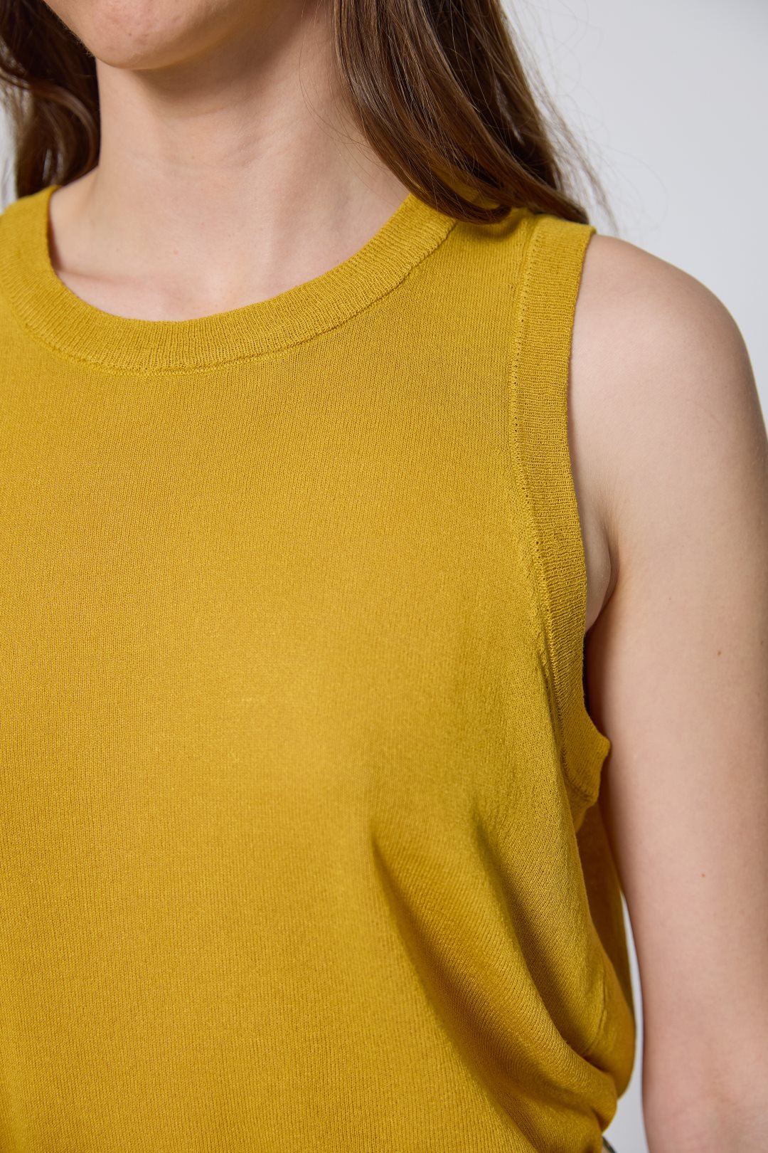 Jersey de punto de viscosa y poliamida presenta un diseño limpio y actual, con un corte sin mangas que deja los hombros al aire y un escote redondo que aporta una línea suave y equilibrada, creando una prenda versátil y cómoda para looks desenfadados.