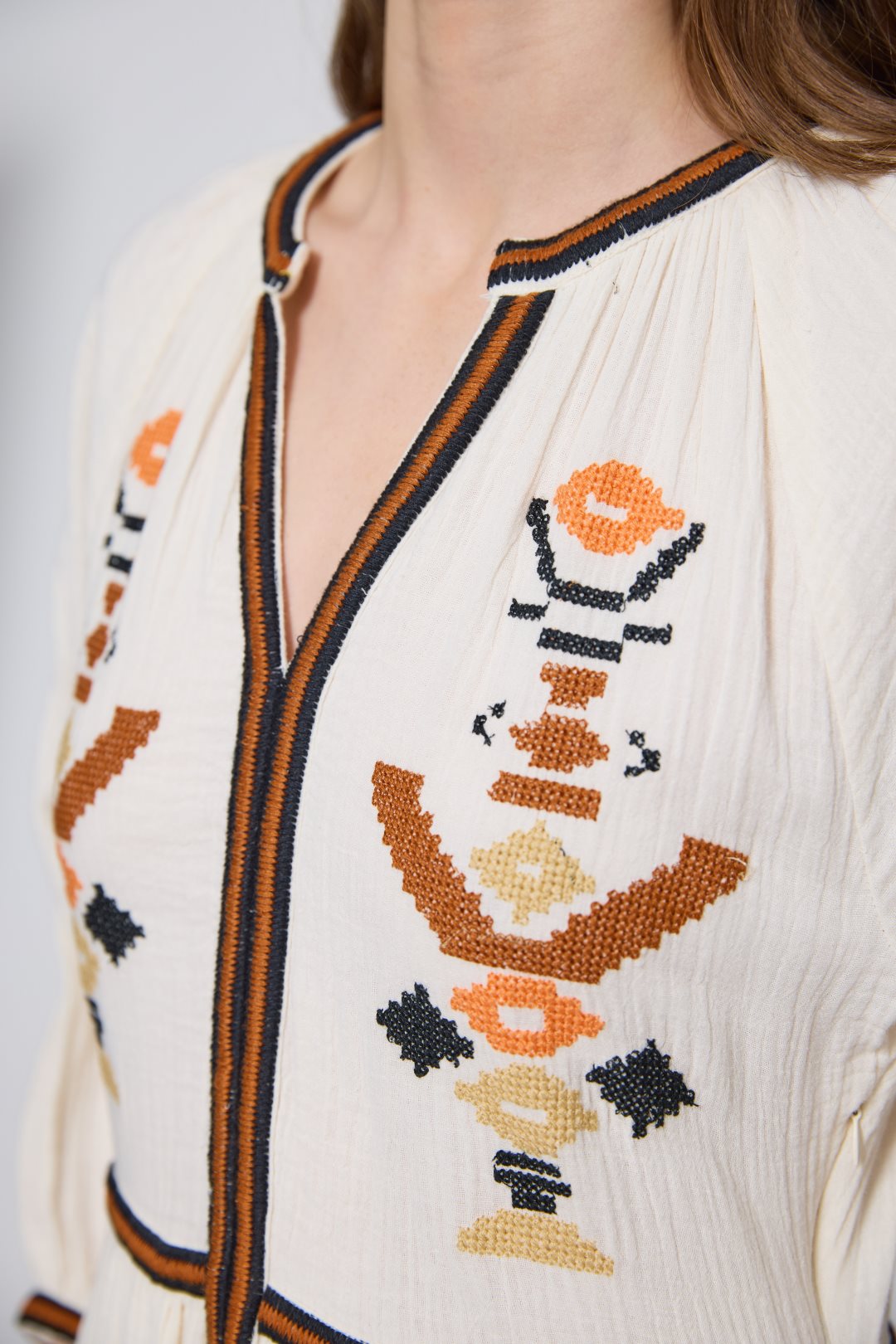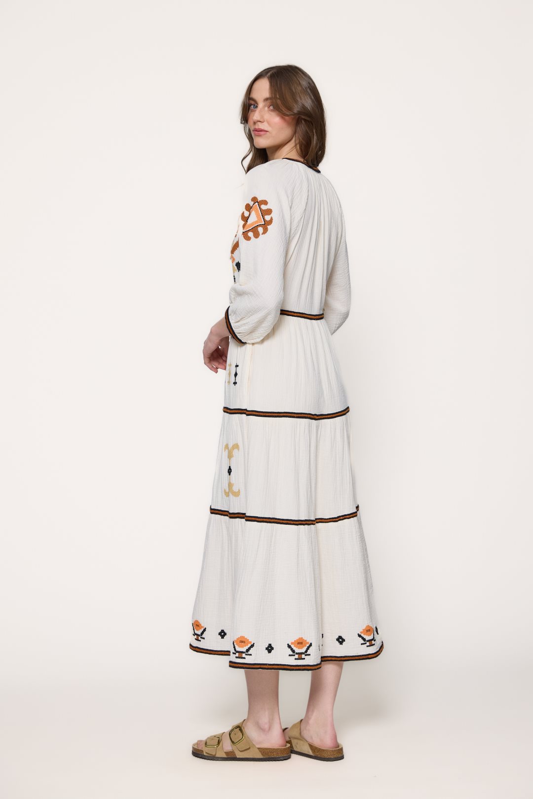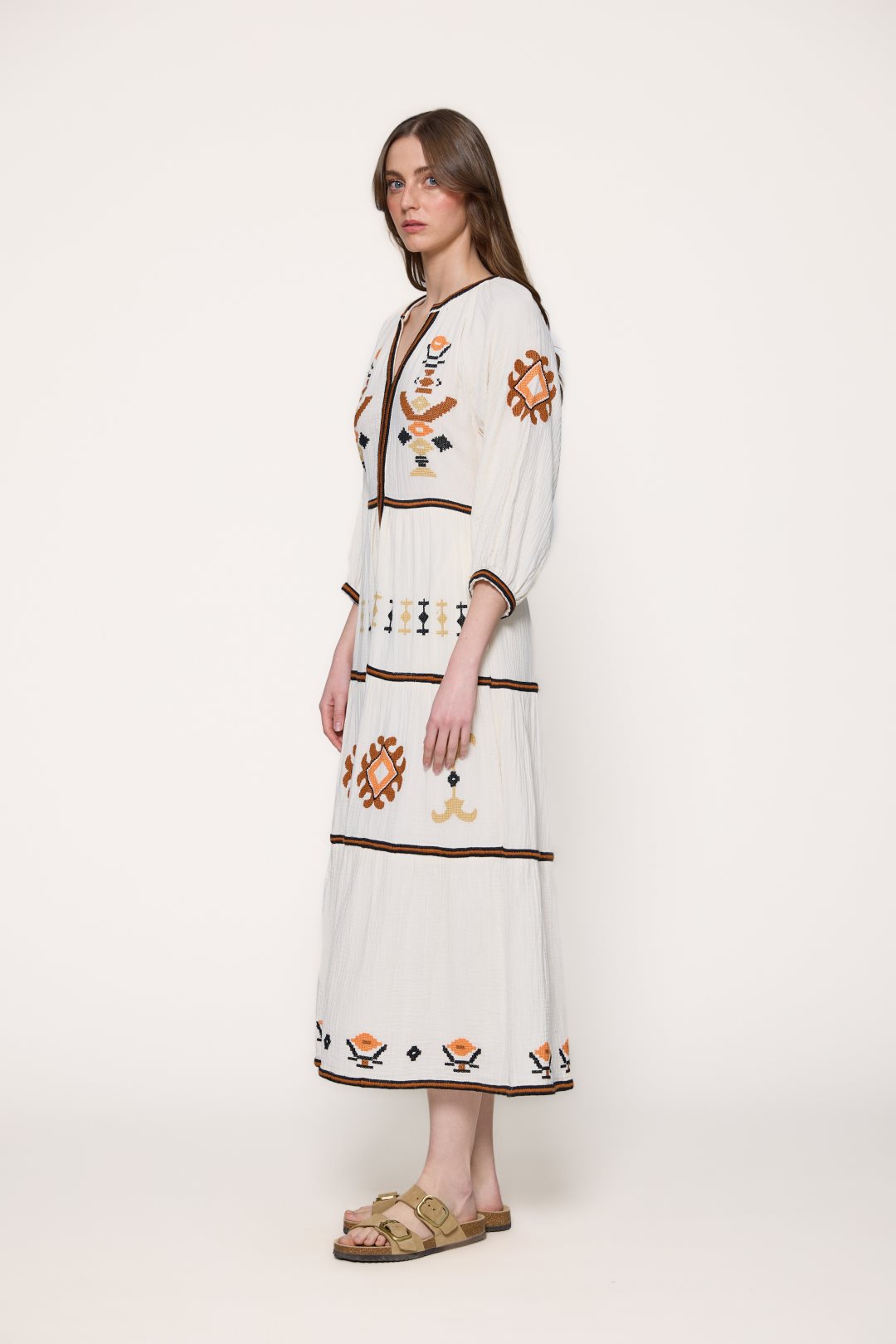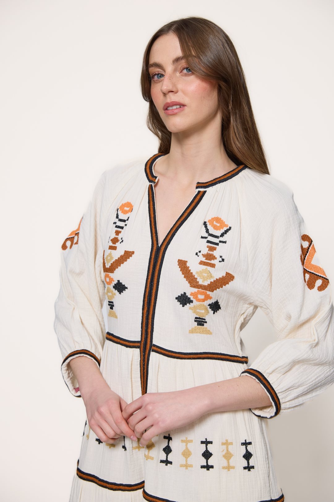 Vestido de longitud maxi silueta de estilo bohemio y artesanal, confeccionada en un tejido de algodón con textura tipo muselina o double gauze, que le otorga un aspecto ligeramente rugoso, natural y muy vaporoso. El diseño destaca por un cuello redondo que se abre en una generosa V, enmarcado por un ribete geométrico en contraste que recorre verticalmente todo el frontal de la prenda. Las mangas son de largo tres cuartos y presentan un ligero acabado abullonado con puños elásticos decorados a juego.La estructura del vestido se organiza en varios paneles horizontales fruncidos que crean una falda con mucho volumen y movimiento. Como elemento visual distintivo, la prenda está enriquecida con bordados étnicos de formas geométricas y romboidales distribuidos de manera simétrica por el pecho, las mangas y los diferentes niveles de la falda, aportando una estética rica y detallada sobre la base lisa del tejido.