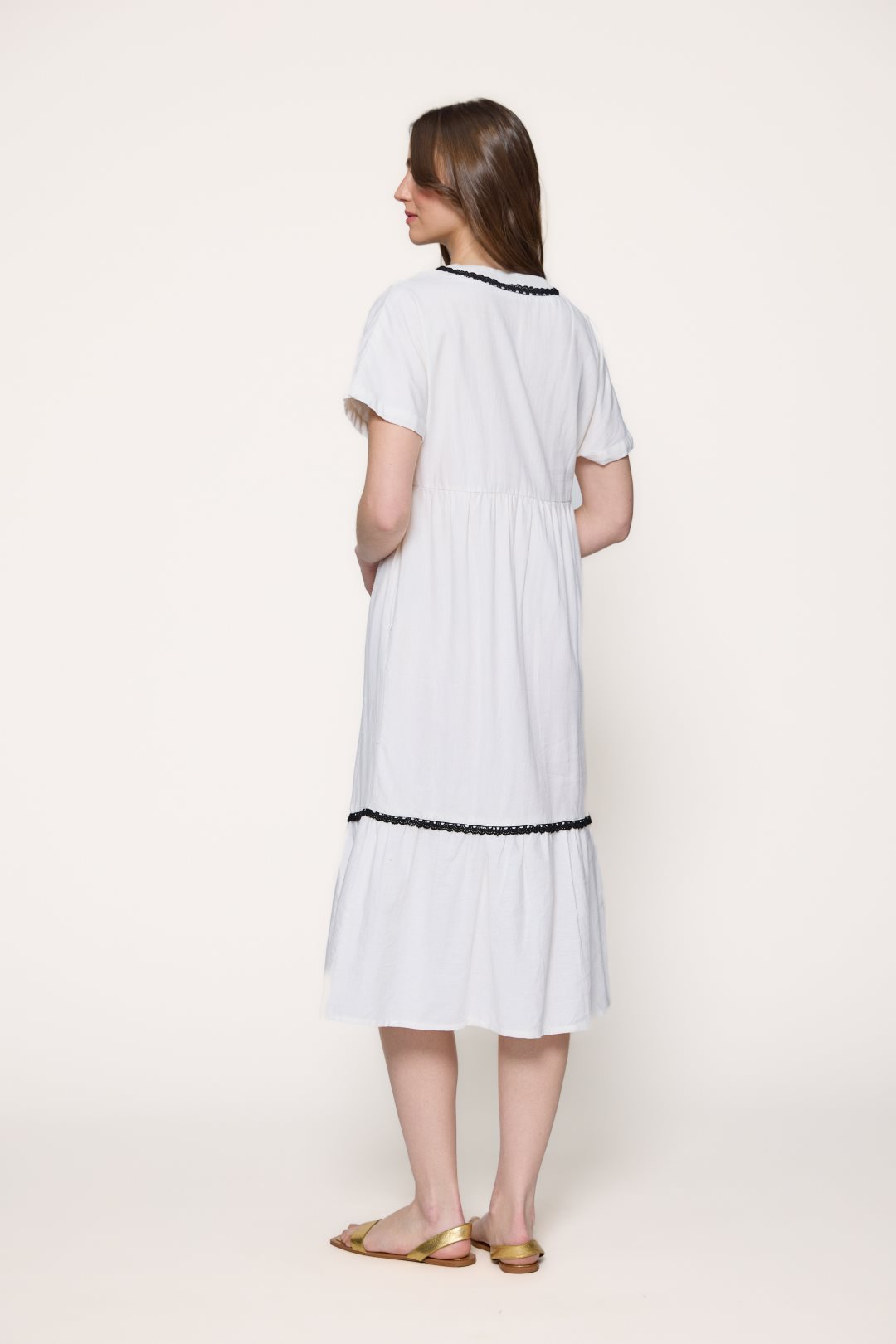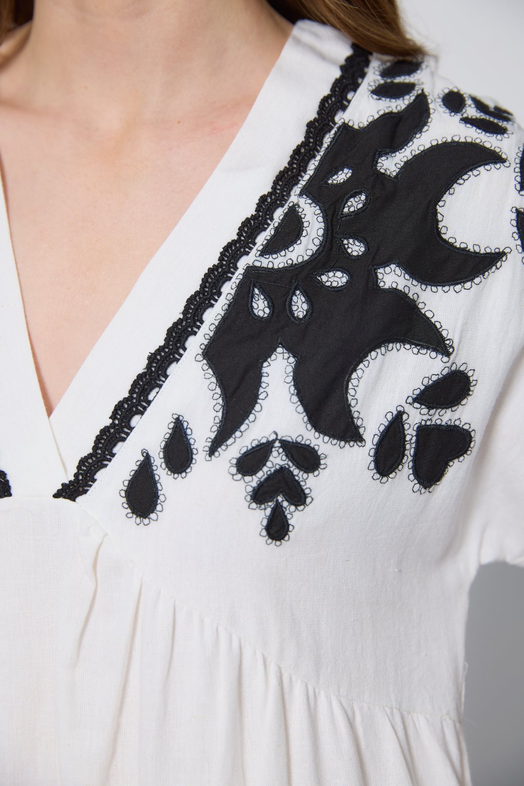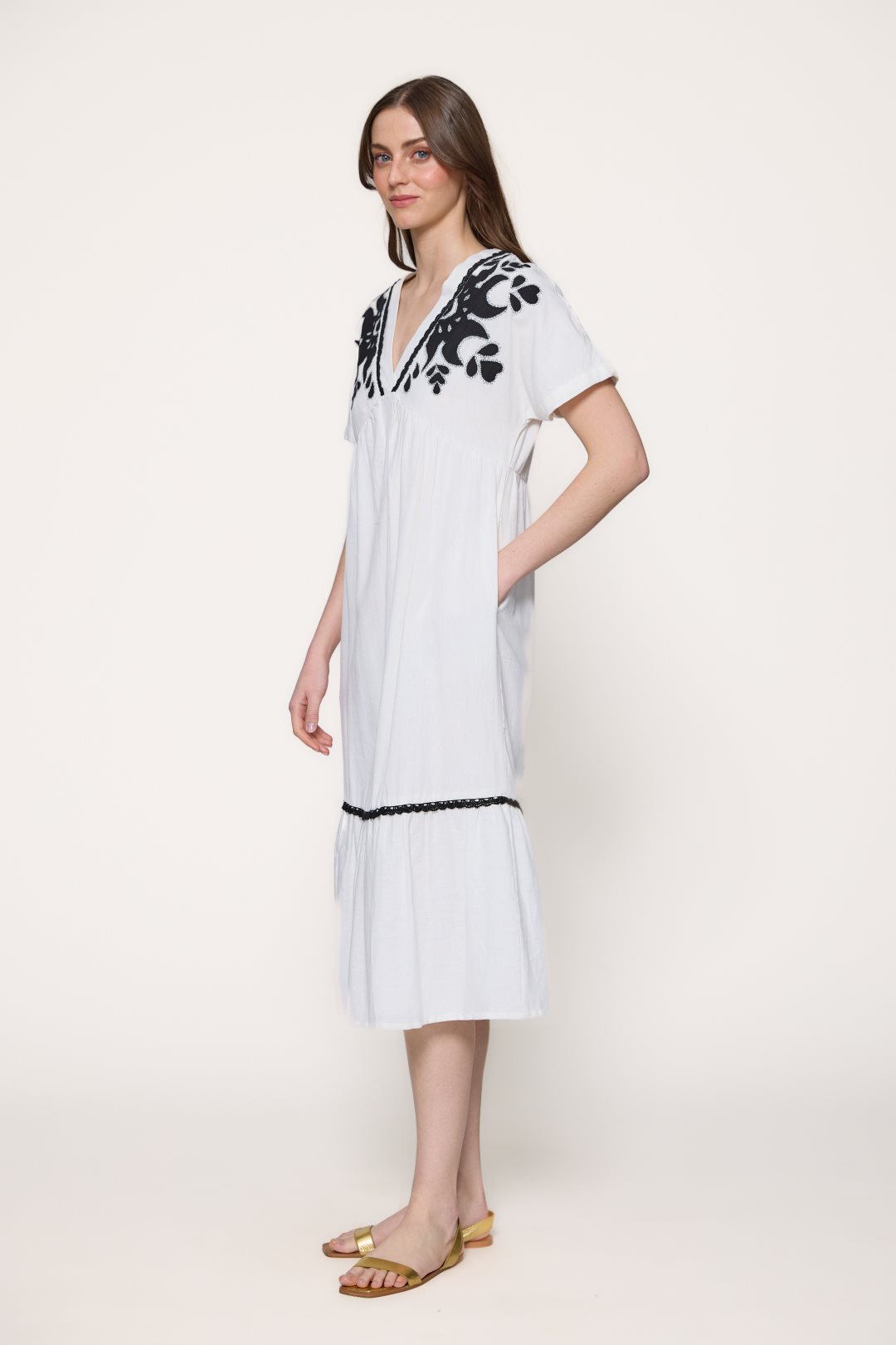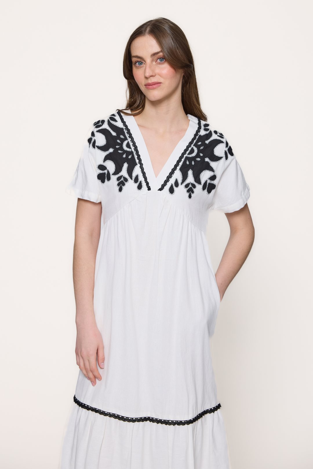 Vestido de corte midi con silueta de estilo romántico confeccionada en un tejido de algodón que aporta frescura y una estructura ligera. Escote en pico o en V, enmarcado por una delicada tira de encaje o pasamanería en contraste, detalle que se repite en el corte horizontal de la falda para delimitar un amplio volante en el bajo. Las mangas cortas de estilo raglán mantienen una caída sencilla que complementa el aire femenino de la prenda. Como elemento visual principal, el vestido incorpora un bordado ornamental de inspiración étnica en la zona de los hombros y el pecho, con motivos vegetales estilizados que resaltan sobre la superficie lisa, otorgándole un carácter artesanal y sofisticado.