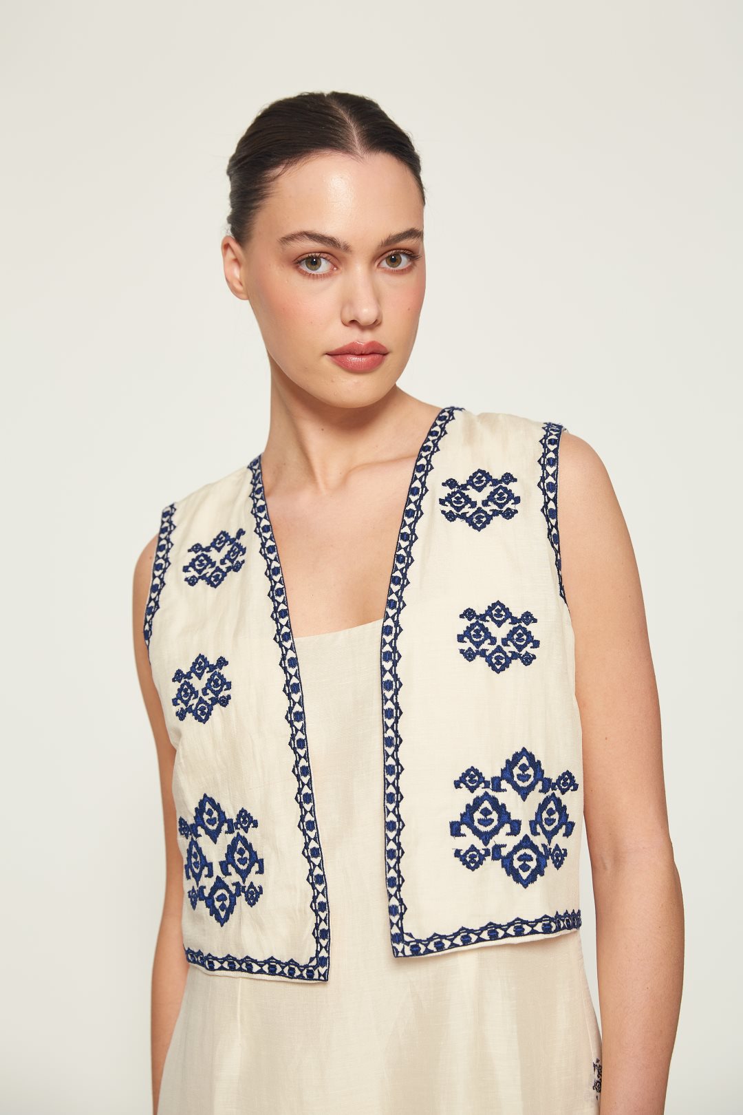 Descubre la sofisticación y frescura del vestido midi sin mangas de VAN-DOS. Este diseño destaca por sus delicados bordados de olas azules, creando un efecto visual que recuerda la calma del mar. Su escote en pico resalta la elegancia natural, mientras que la mezcla de lino y viscosa asegura comodidad y ligereza durante los cálidos días de primavera y verano. Ideal para ocasiones especiales o un día casual, este vestido midi es una pieza versátil que aporta un toque de frescura y estilo a tu vestuario.