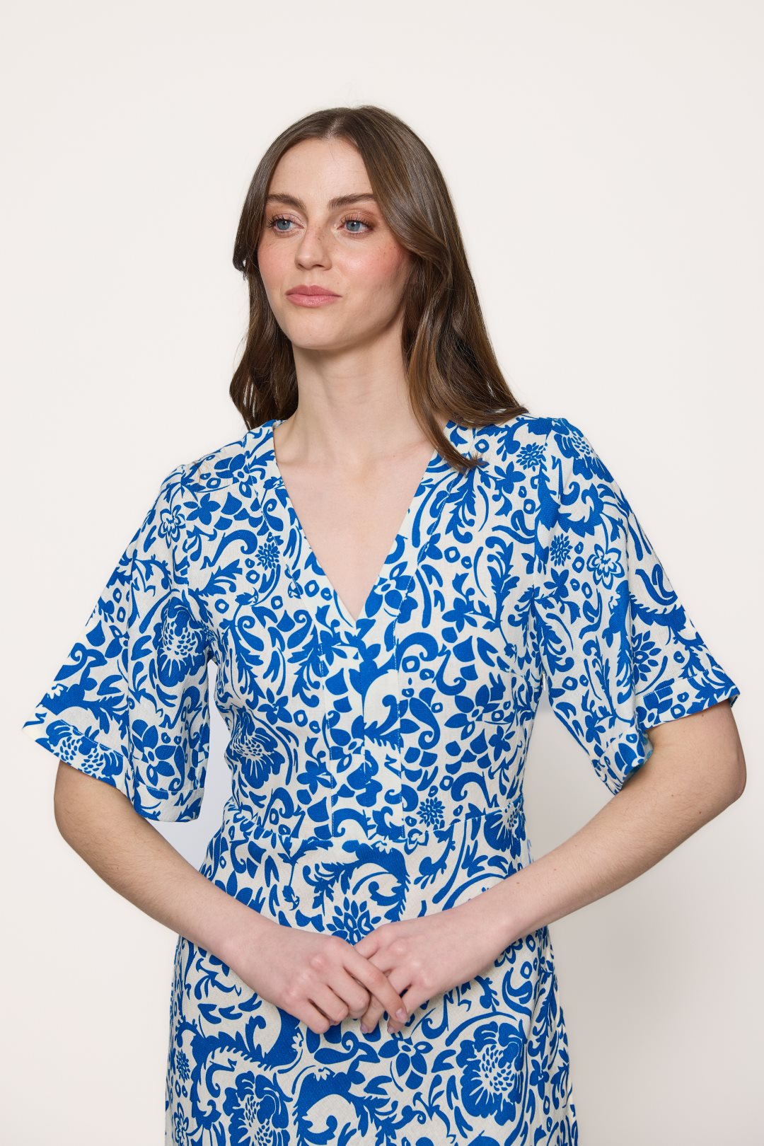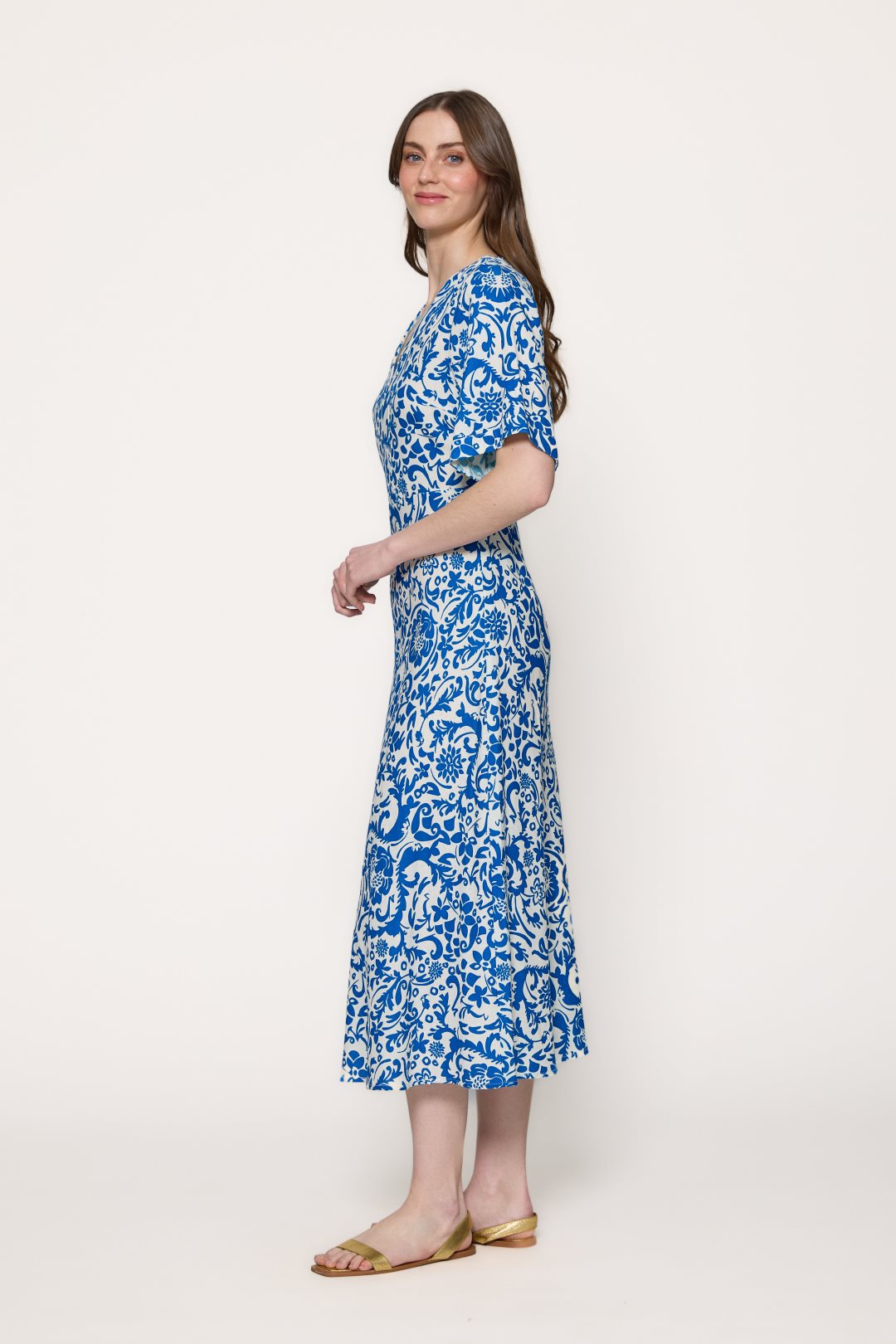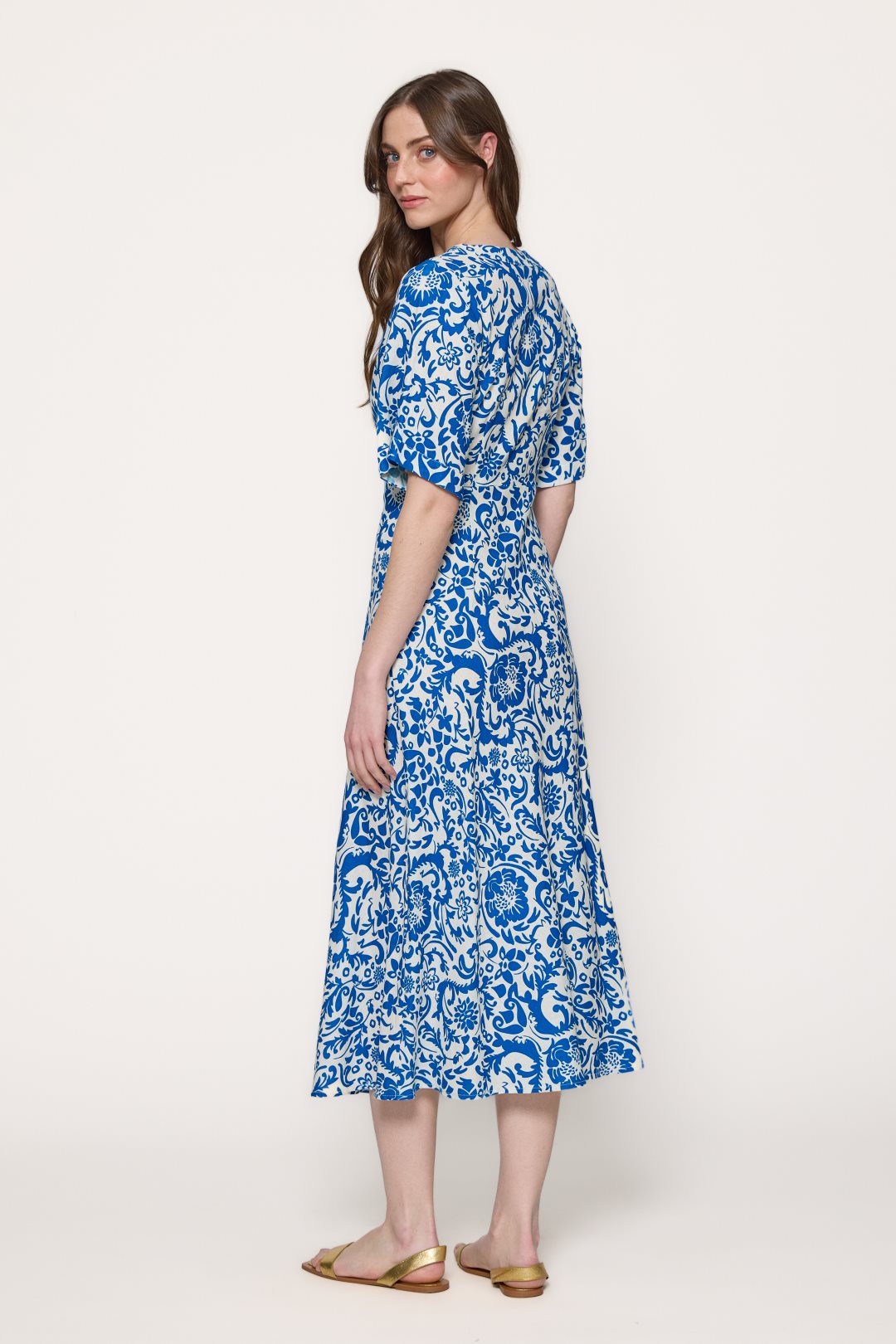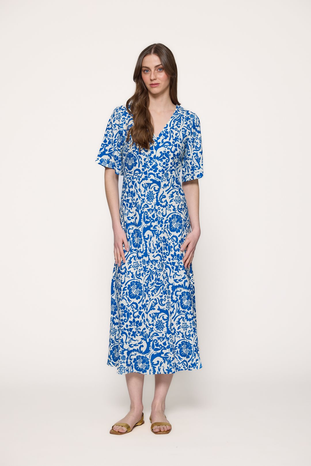 Vestido de longitud midi presenta una silueta fluida y relajada, confeccionada en un tejido de lino con viscosa que proporciona una caída suave y un movimiento ligero. El diseño se caracteriza por un escote en pico o en V que enmarca el rostro de forma sencilla, dando paso a una hilera de botones frontales que recorre la parte superior de la prenda. Las mangas son cortas y de corte amplio, lo que refuerza su estética cómoda y estival. La pieza destaca por su llamativa estampación de inspiración floral y ornamental, con motivos intrincados que cubren toda la superficie, recordando a los diseños de la cerámica clásica o el estilo paisley. La falda de línea evasé completa este diseño versátil, ideal para un look de día sofisticado y fresco.