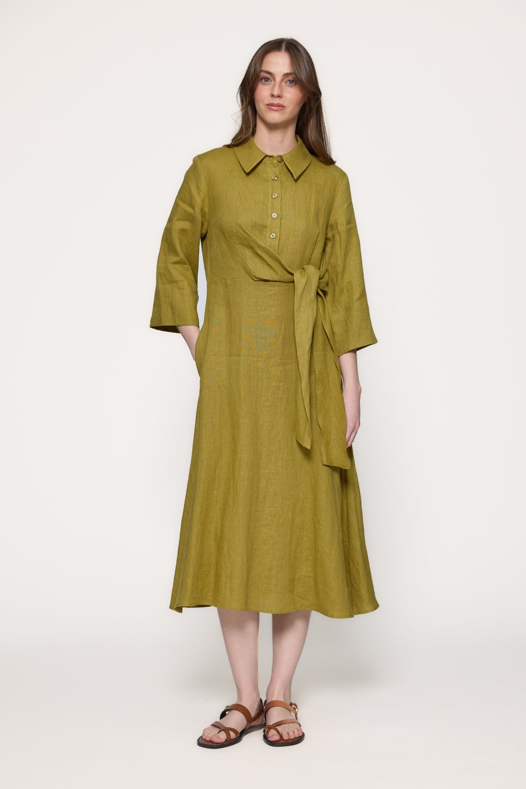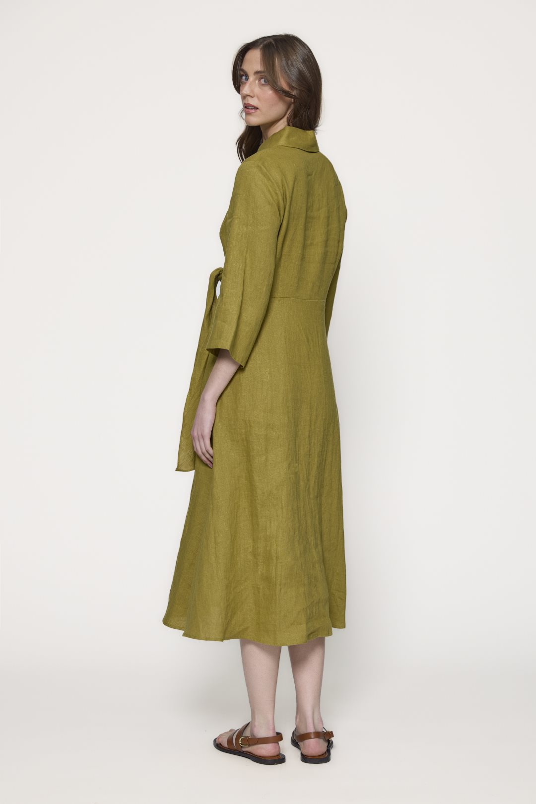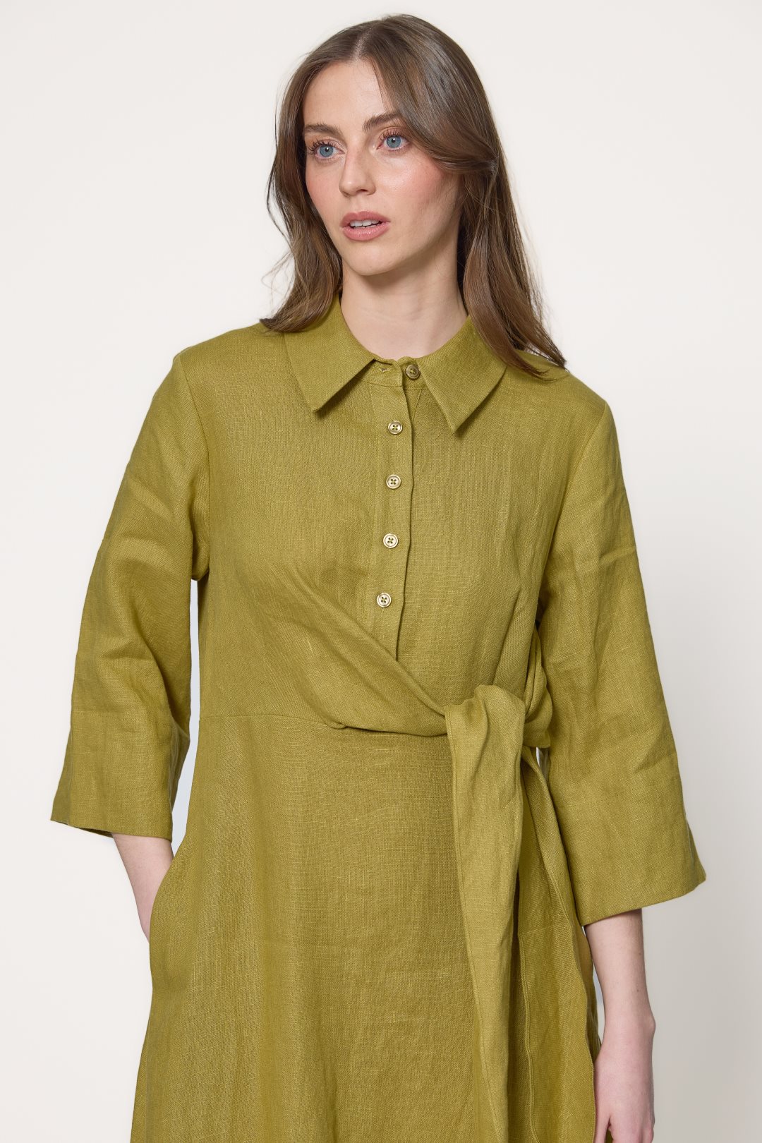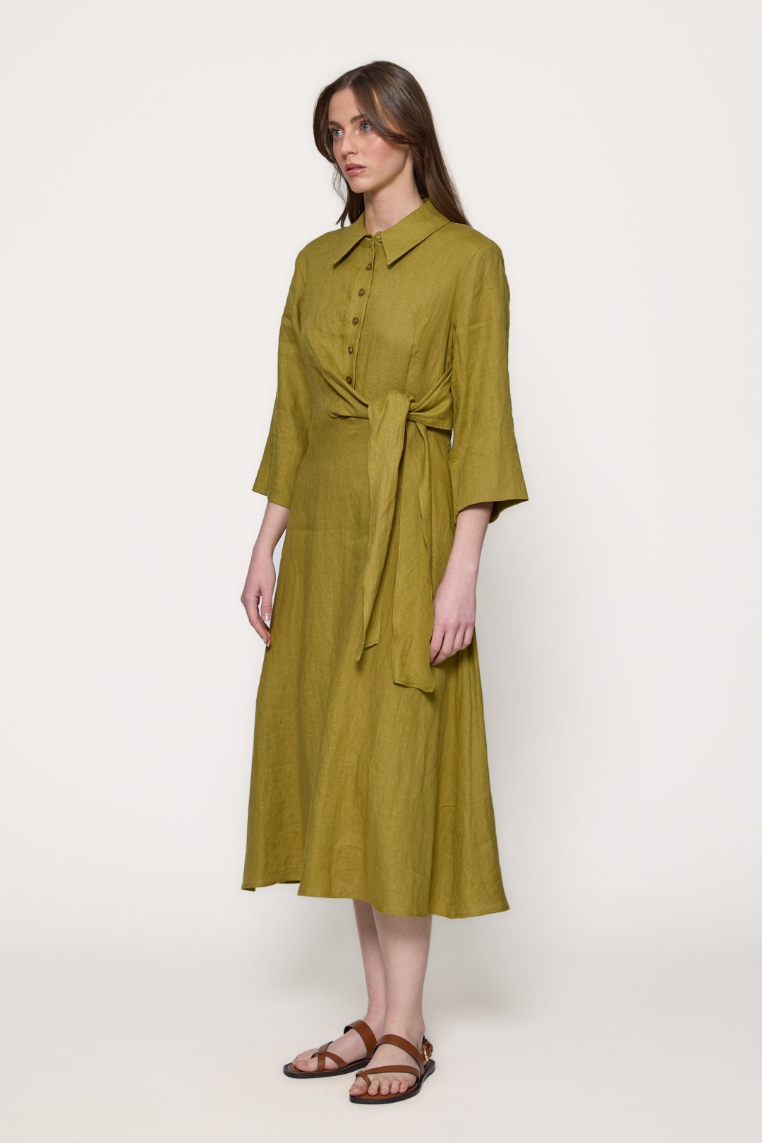 Vestido largo midi estilo camisero confeccionado íntegramente en tejido de lino, lo que le otorga una textura orgánica, transpirable y con ese sutil cuerpo característico de las fibras naturales. El diseño destaca por un cuello camisero clásico con solapas, que da paso a una botonadura frontal parcial que llega hasta la cintura. Las mangas son de largo tres cuartos (francesas), aportando un aire equilibrado y elegante a la silueta. La prenda se define por un detalle de nudo o lazada lateral en el talle, que genera un drapeado natural y entalla la figura antes de abrirse en una falda de línea evasé. Pieza clave para conjuntos frescos y sofisticados.