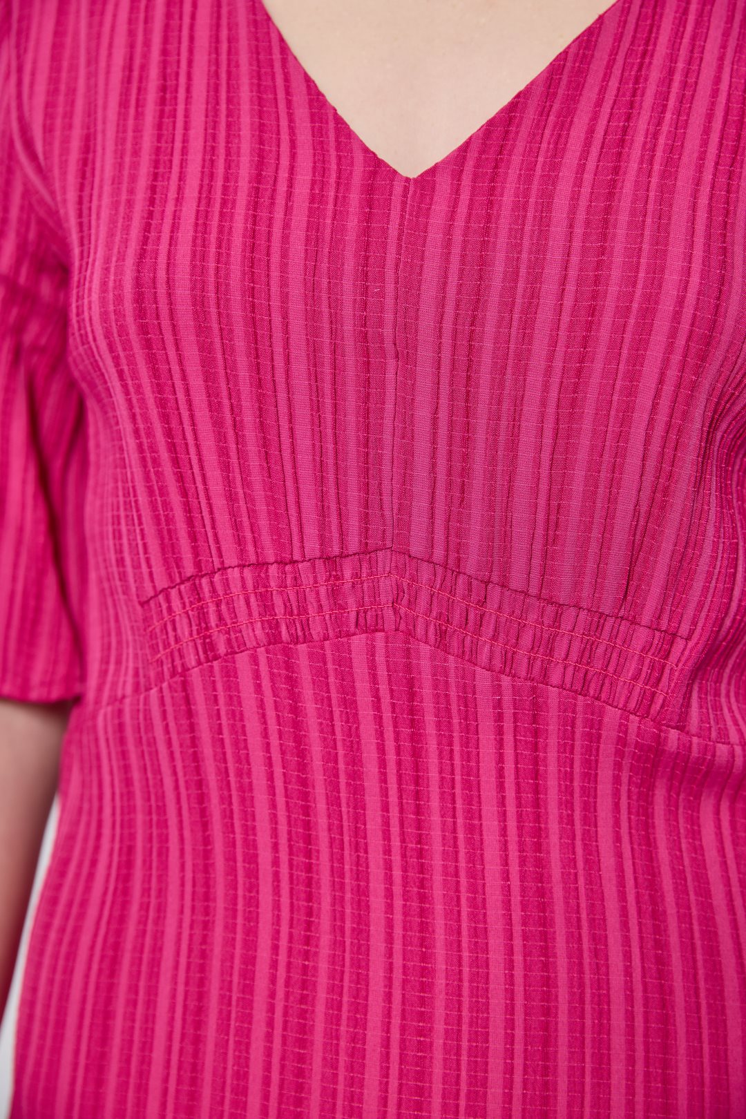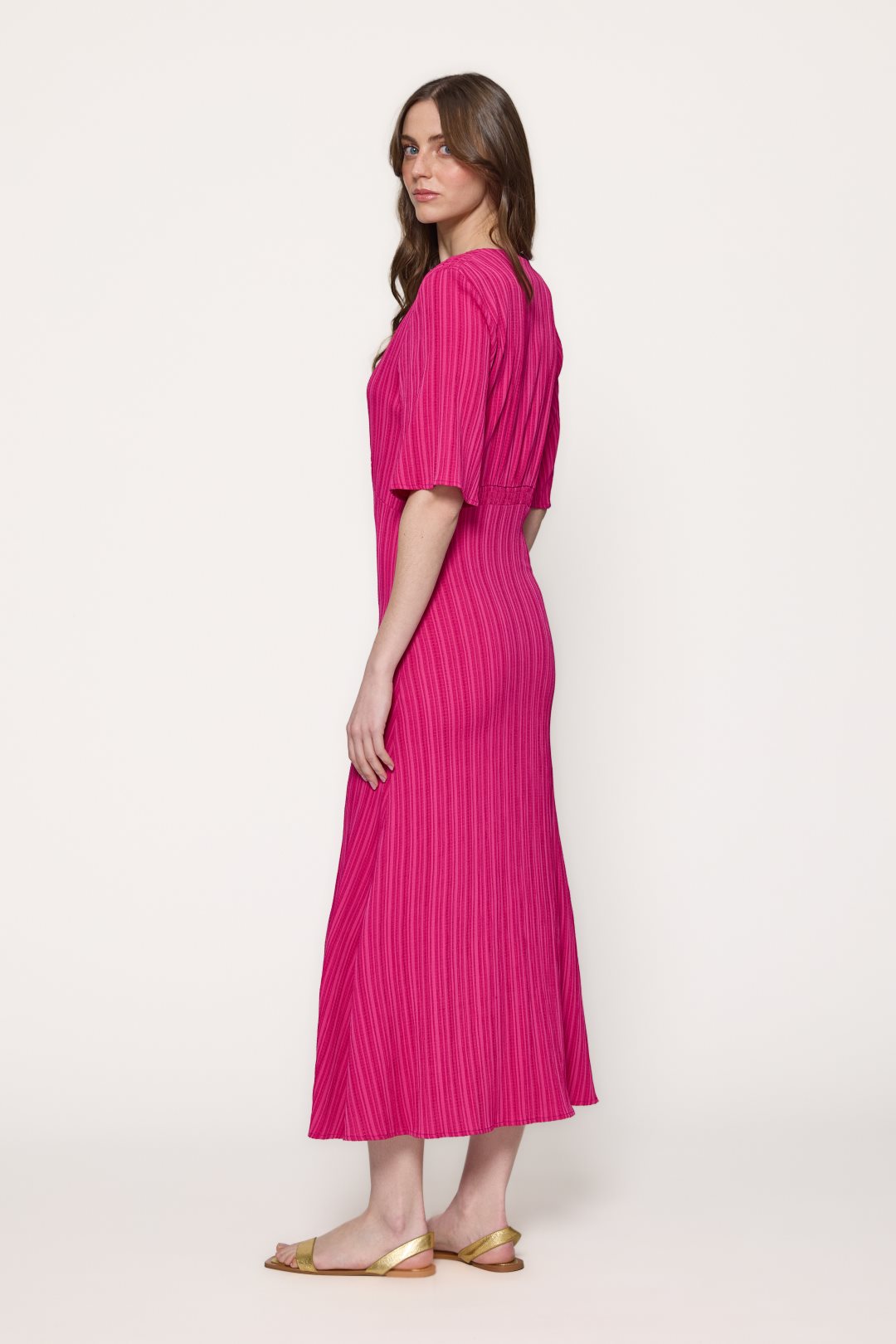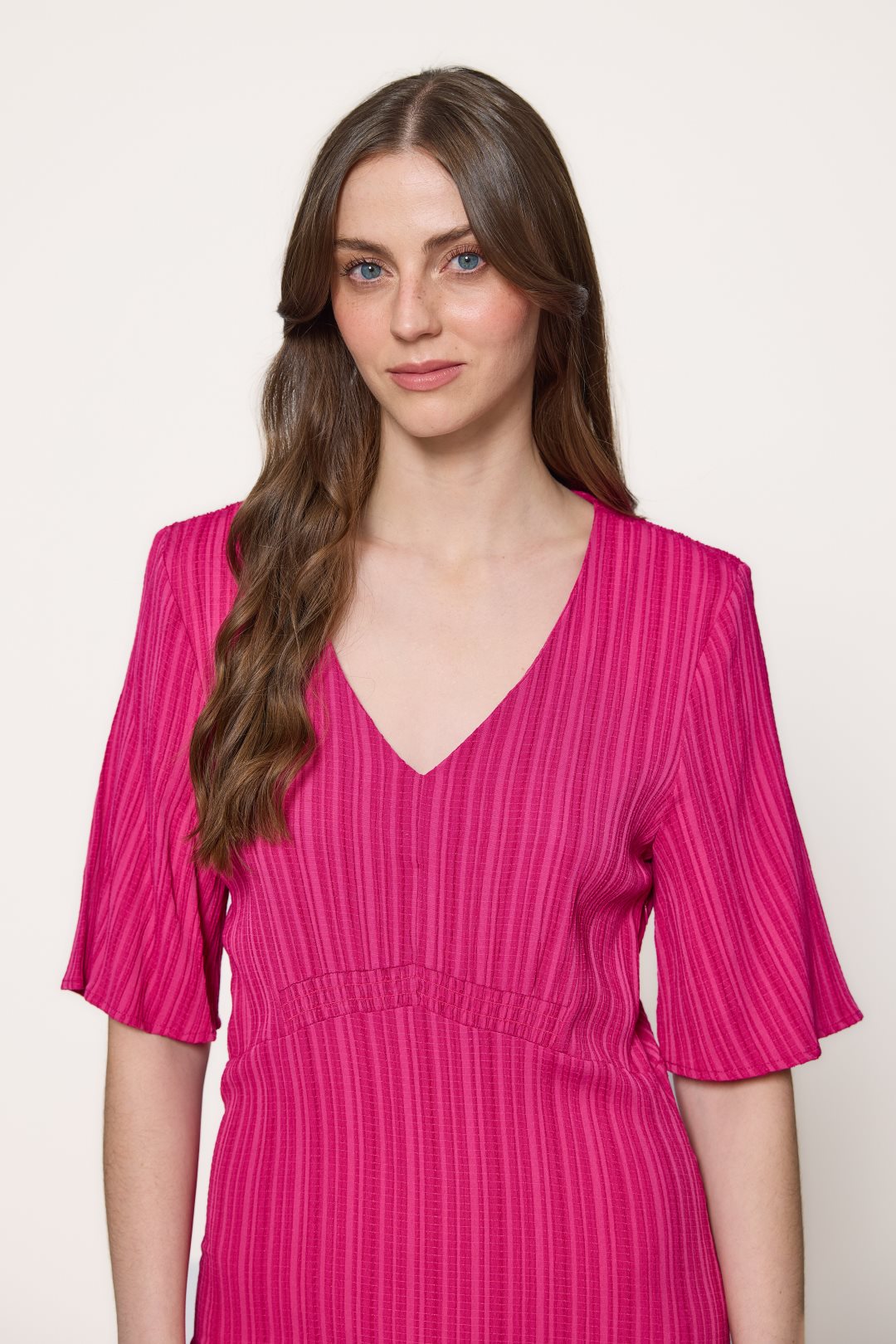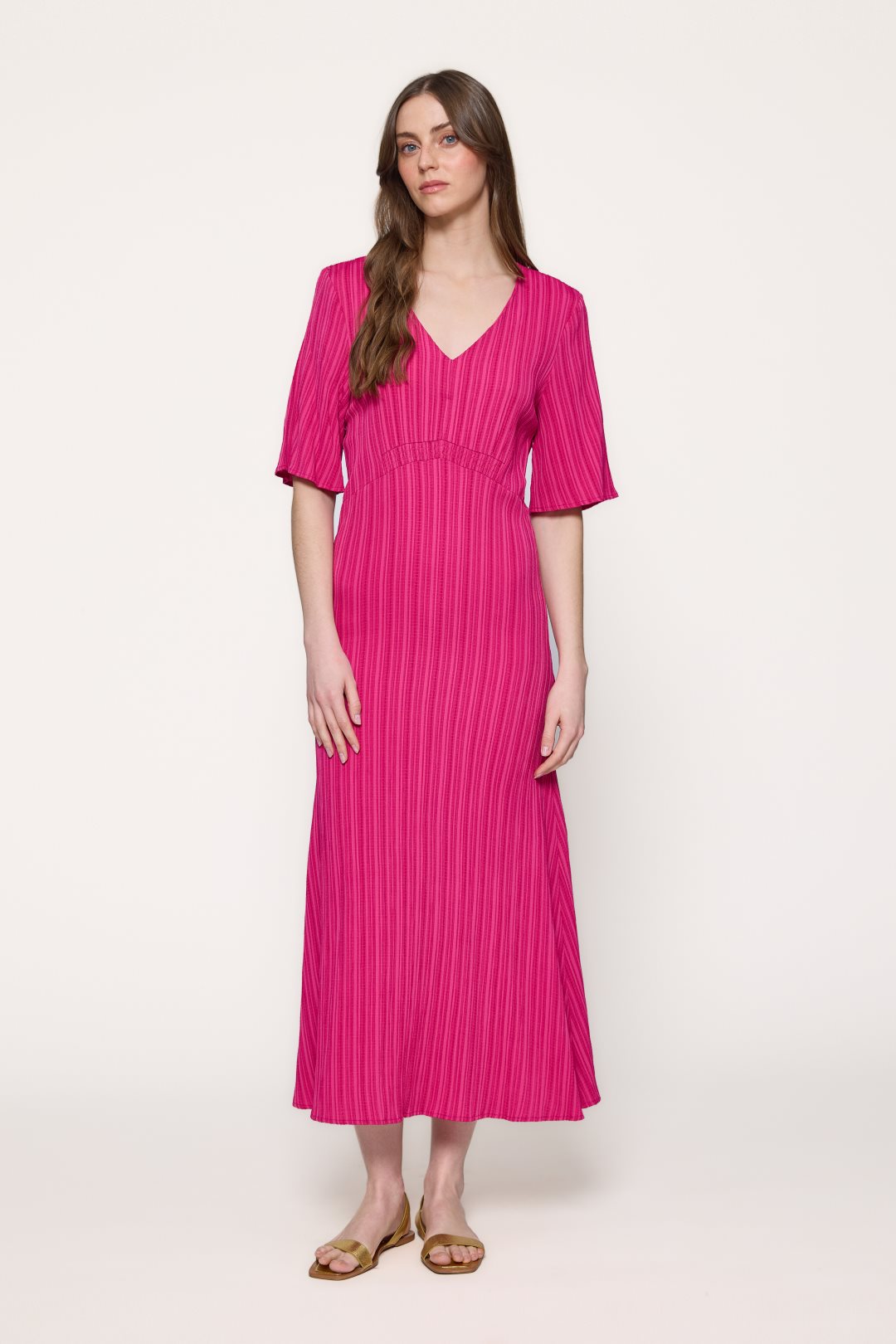 Vestido largo midi presenta una silueta de inspiración retro con un corte imperio que estiliza la figura. El diseño destaca por un escote en pico o en V que se une a una costura bajo el pecho levemente fruncida, aportando estructura a la parte superior. Las mangas cortas cuentan con un corte recto y sencillo que equilibra el volumen de la falda evasé. El tejido de viscosa destaca por su caída fluida y un acabado satinado que presenta una textura de micro-plisado, lo que añade profundidad visual y movimiento a la prenda.