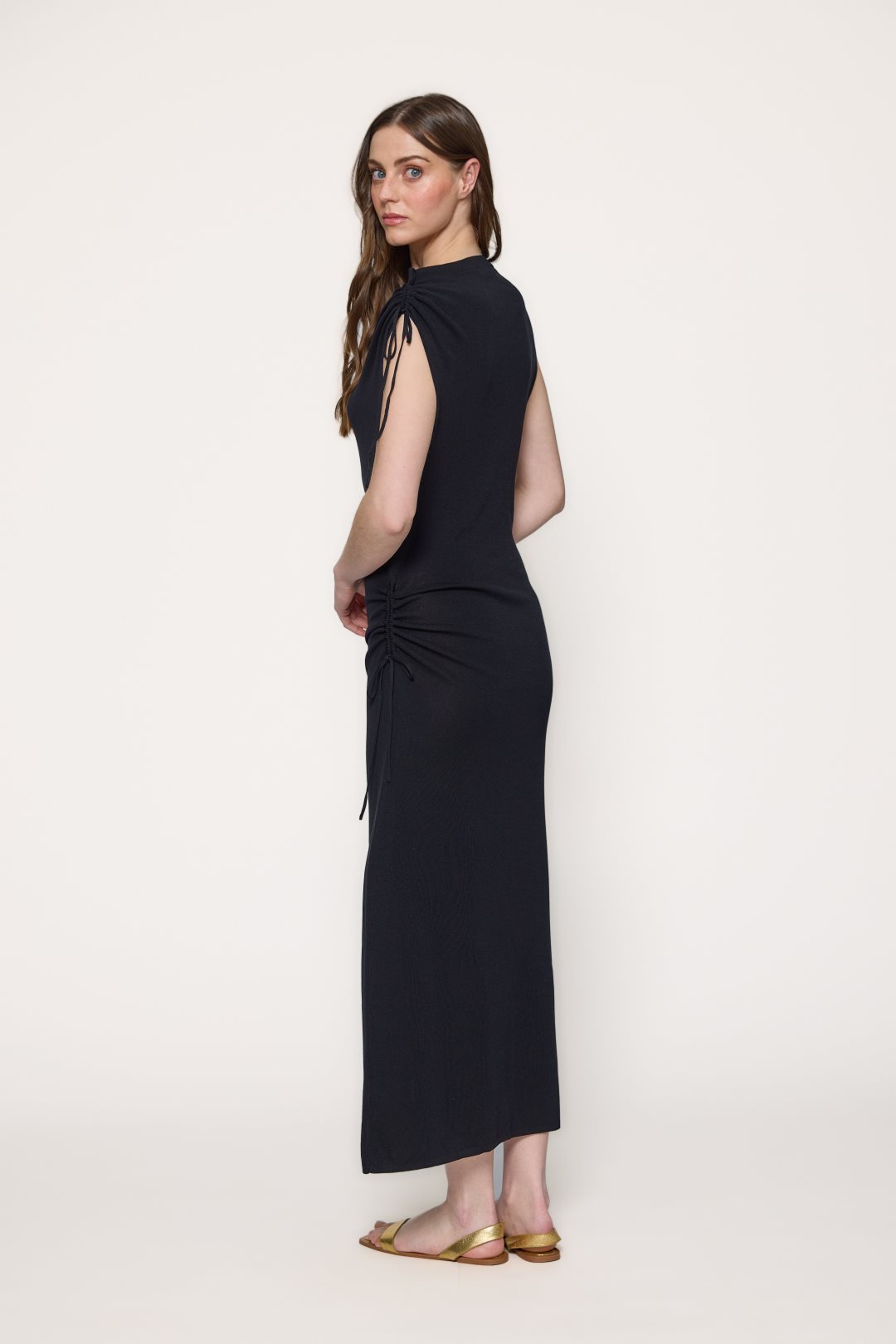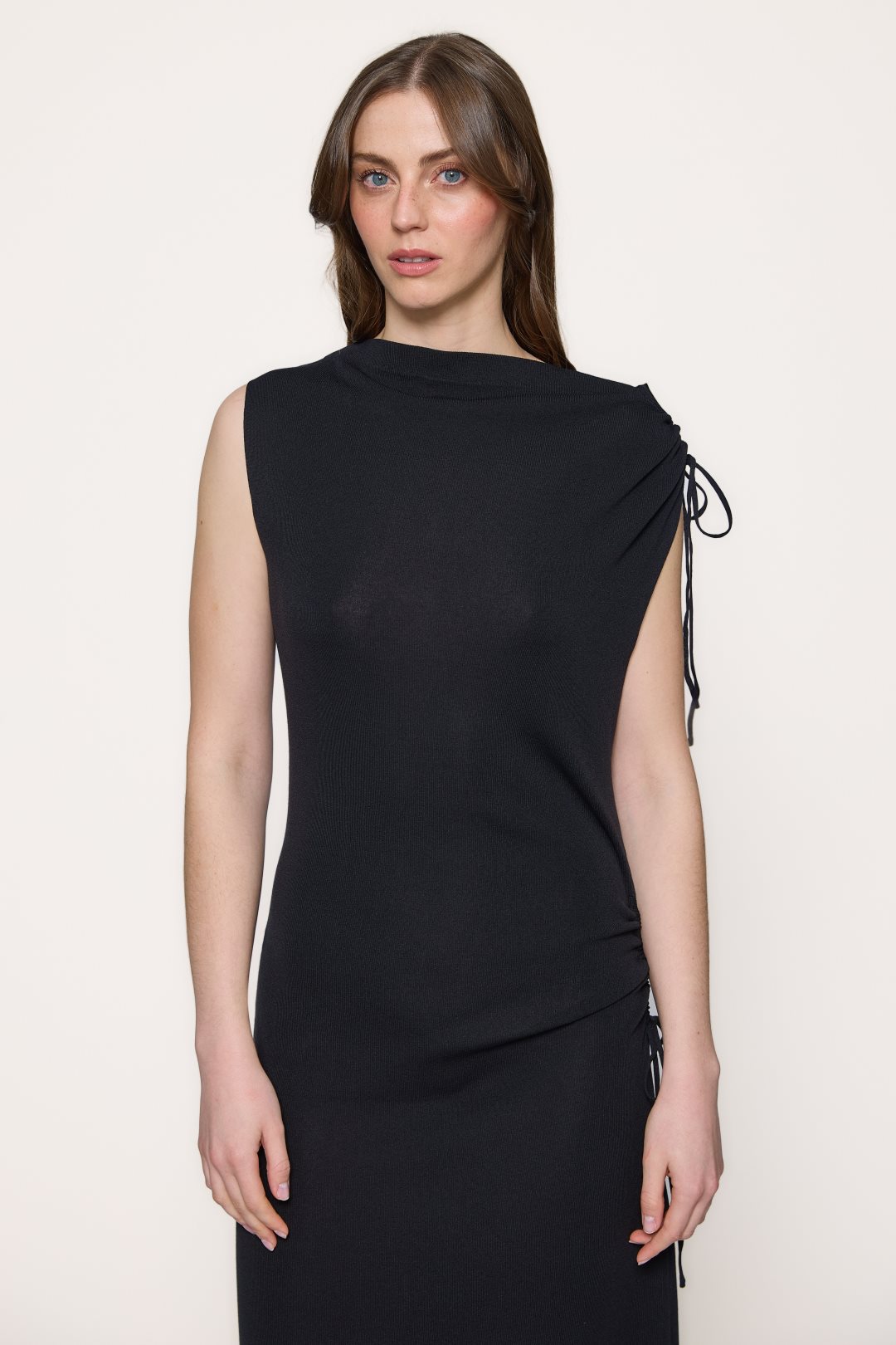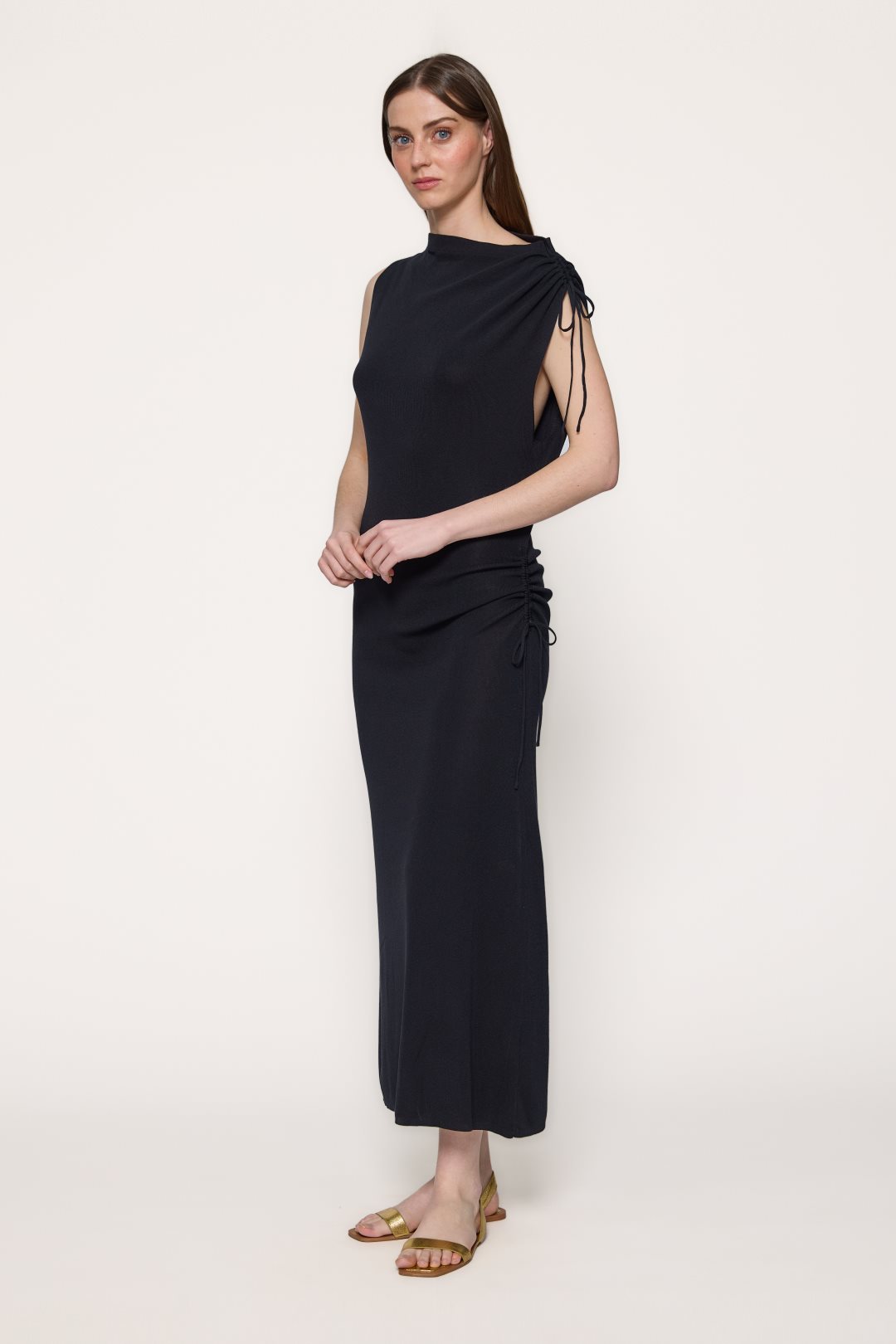 Vestido de punto que combina viscosa y poliéster, ofreciendo una caída fluida y una textura suave que se adapta con naturalidad a la silueta. Su diseño presenta un largo midi, extendiéndose elegantemente hasta la zona de los tobillos, y se caracteriza por una manga sisa o estilo sin mangas, lo que le aporta un aire minimalista y fresco ideal para diversas ocasiones.