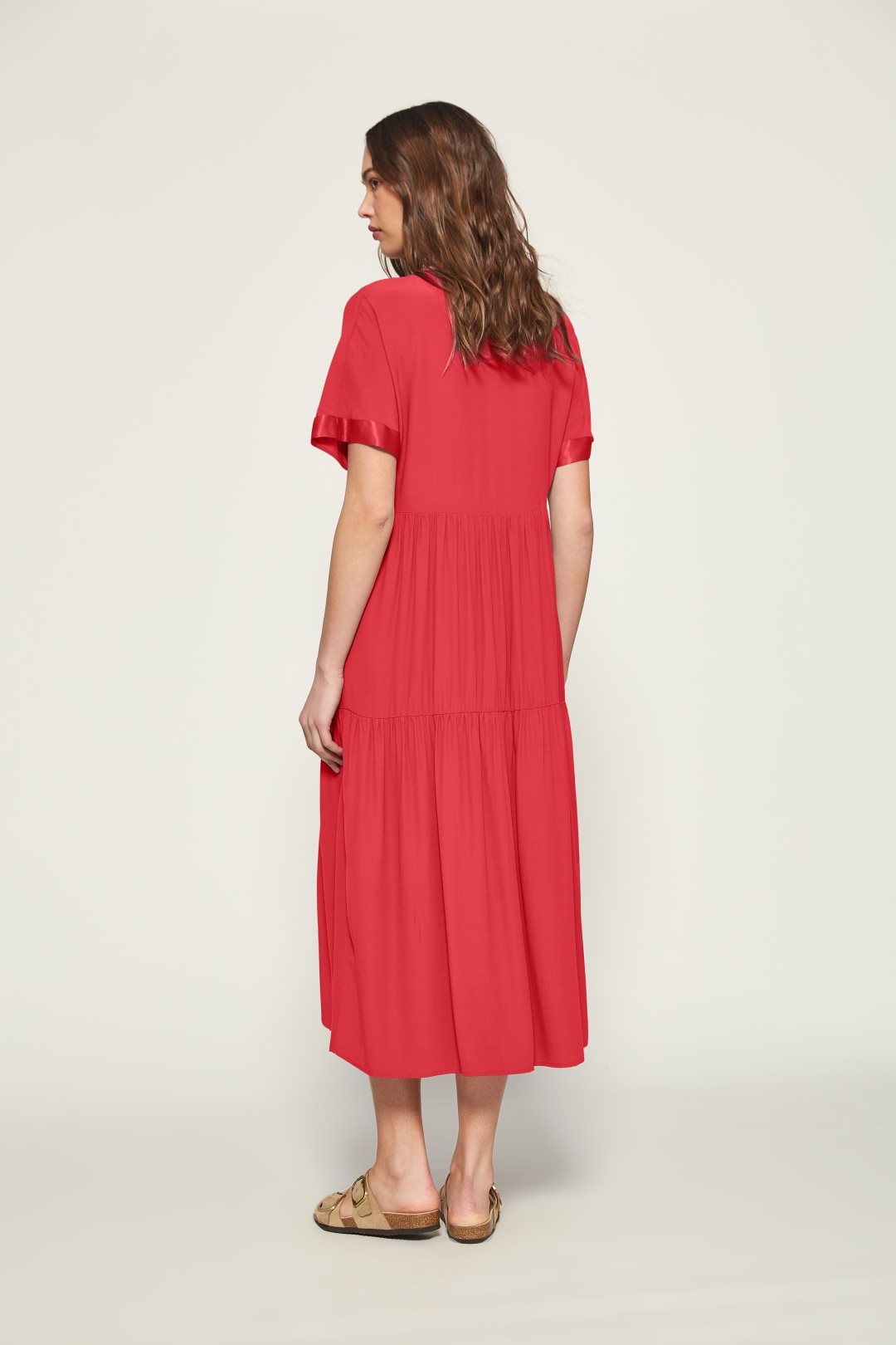 Añade un toque de elegancia y frescura a tus días con este vestido midi fluido de 100% viscosa, diseñado para ofrecerte comodidad y estilo en cualquier ocasión. Su escote de pico y manga corta realzan su diseño atemporal, perfecto para combinar con sandalias o zapatillas y disfrutar del buen tiempo con estilo. Su tejido ligero lo convierte en una opción imprescindible para los días cálidos de la temporada.