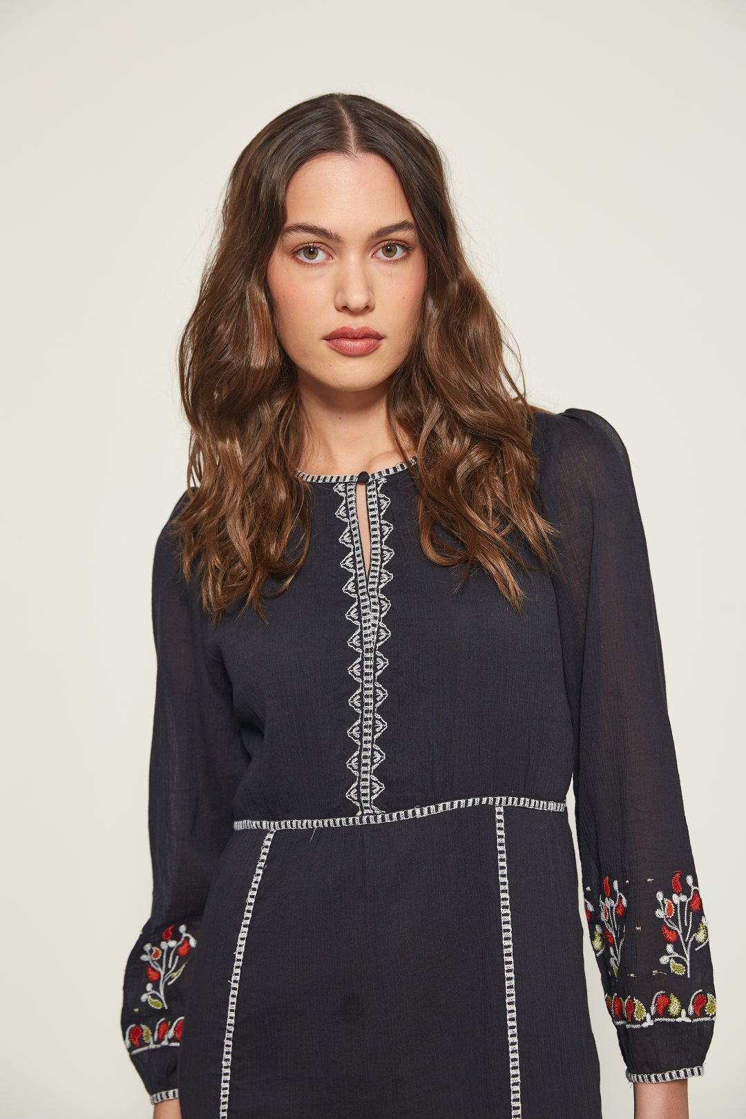 Este vestido largo de la colección primavera-verano de VAN-DOS es una pieza única que combina comodidad y elegancia. Sus mangas 3/4 abullonadas le otorgan un estilo moderno y femenino, mientras que los delicados bordados añaden un detalle sofisticado. El escote redondo complementa su diseño, y su confección en 100% algodón garantiza una sensación agradable al tacto, perfecta para los días más cálidos. Ideal para eventos especiales o para un look sofisticado de diario, este vestido será el centro de todas las miradas.