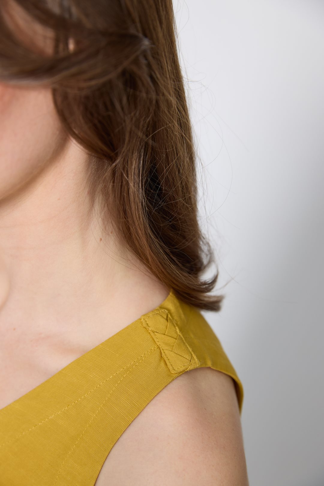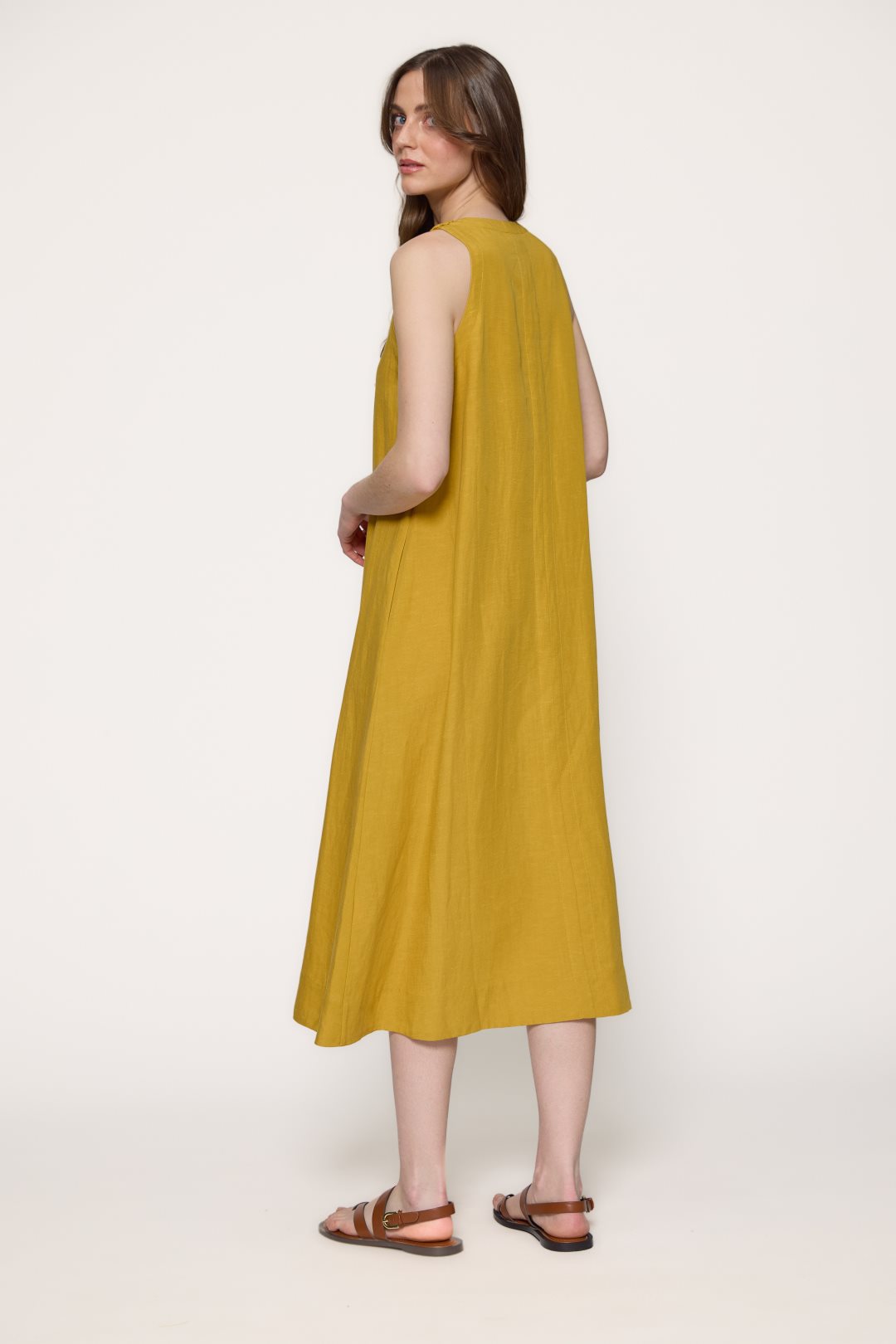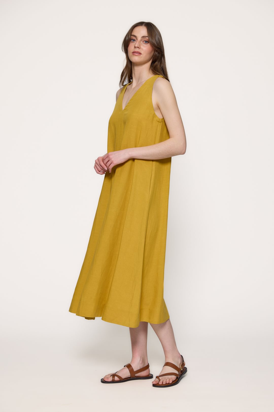 Vestido silueta evasé y largo midi está confeccionado en una mezcla de lyocell y lino, una combinación que aúna la resistencia y el aspecto noble del lino con la suavidad sedosa y la caída excepcional del lyocell. El diseño destaca por un escote en pico o en V muy limpio y favorecedor que alarga visualmente el torso. Al carecer de mangas, su estilo sisa aporta una estética minimalista y fresca, ideal para los días calurosos. La prenda presenta una estructura fluida que cobra volumen gracias a un pliegue invertido central que nace en la zona de la falda, permitiendo un movimiento elegante al caminar.